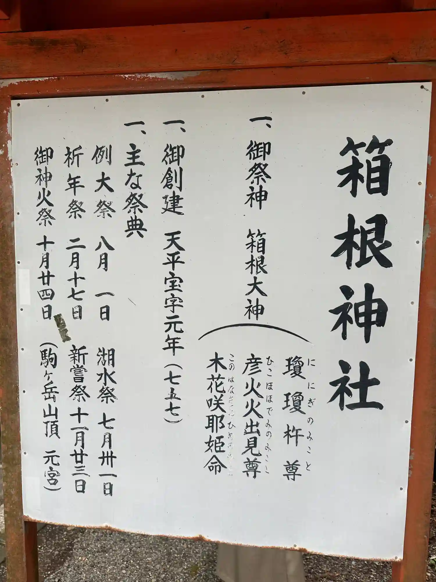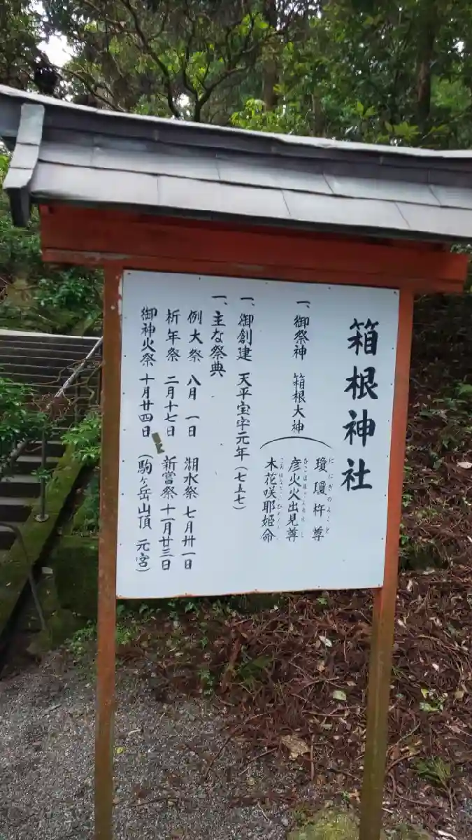 757年、箱根山に入峰修行中の万巻上人が夢で箱根大神の御神託を受け芦ノ湖畔に鎮在された。御祭神は瓊…