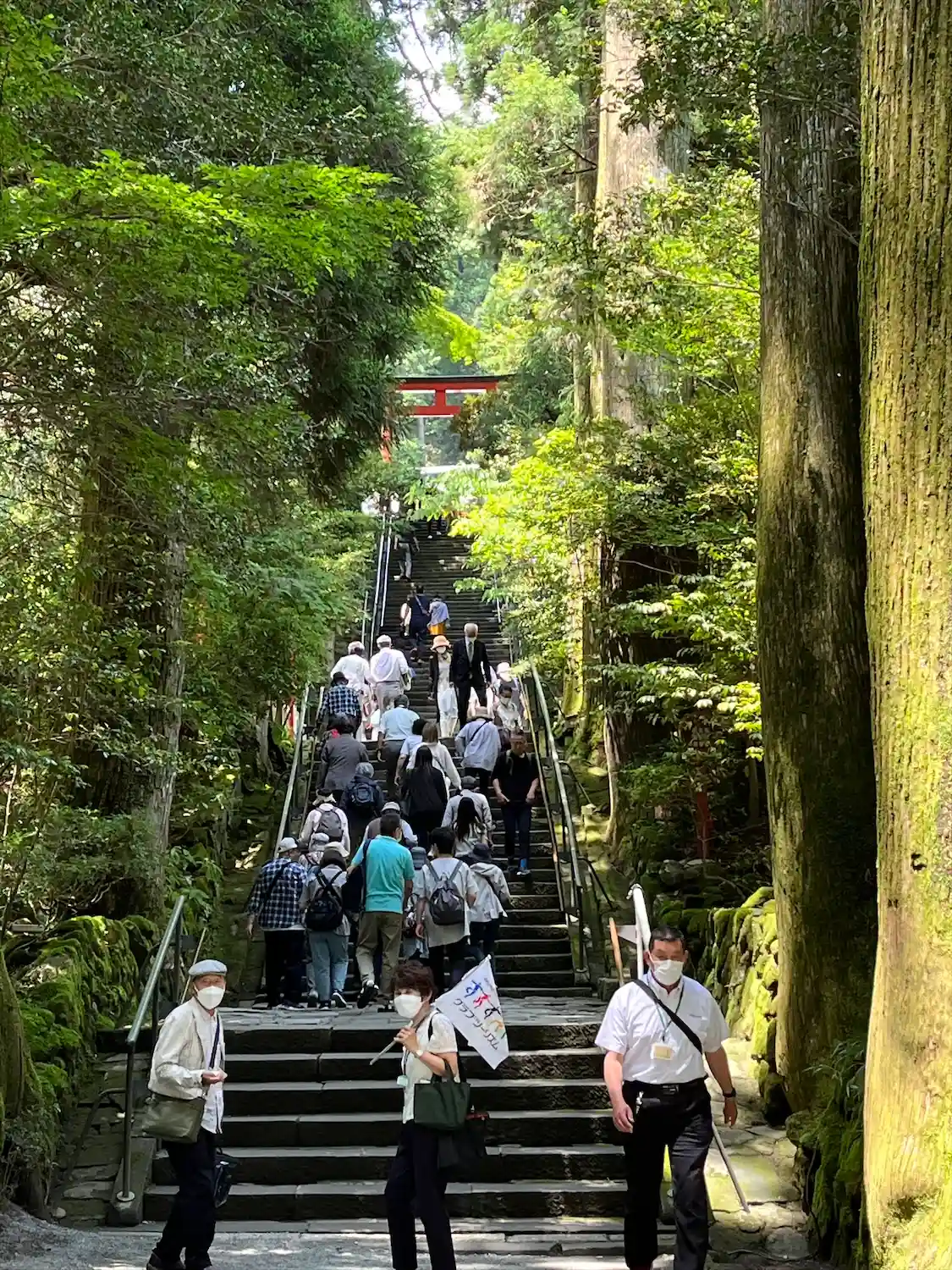 芦ノ湖を船で渡り箱根神社へ。湖沿いの鳥居を過ぎてこんもりと緑生い茂る境内の階段を上って頂きました。…