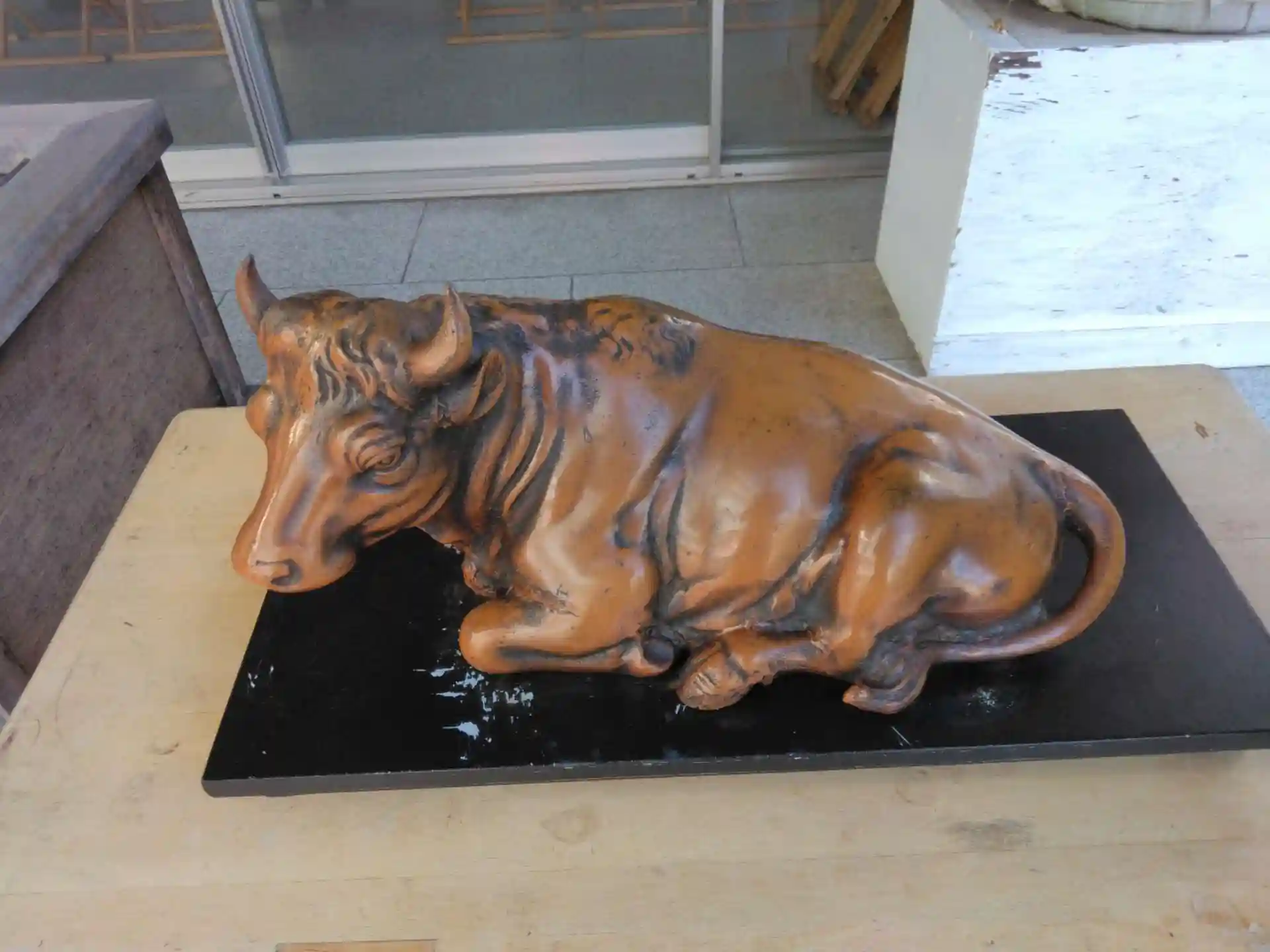 拝殿前には菅原道真公のつかいの牛。良くなりたい場所を撫でることに。