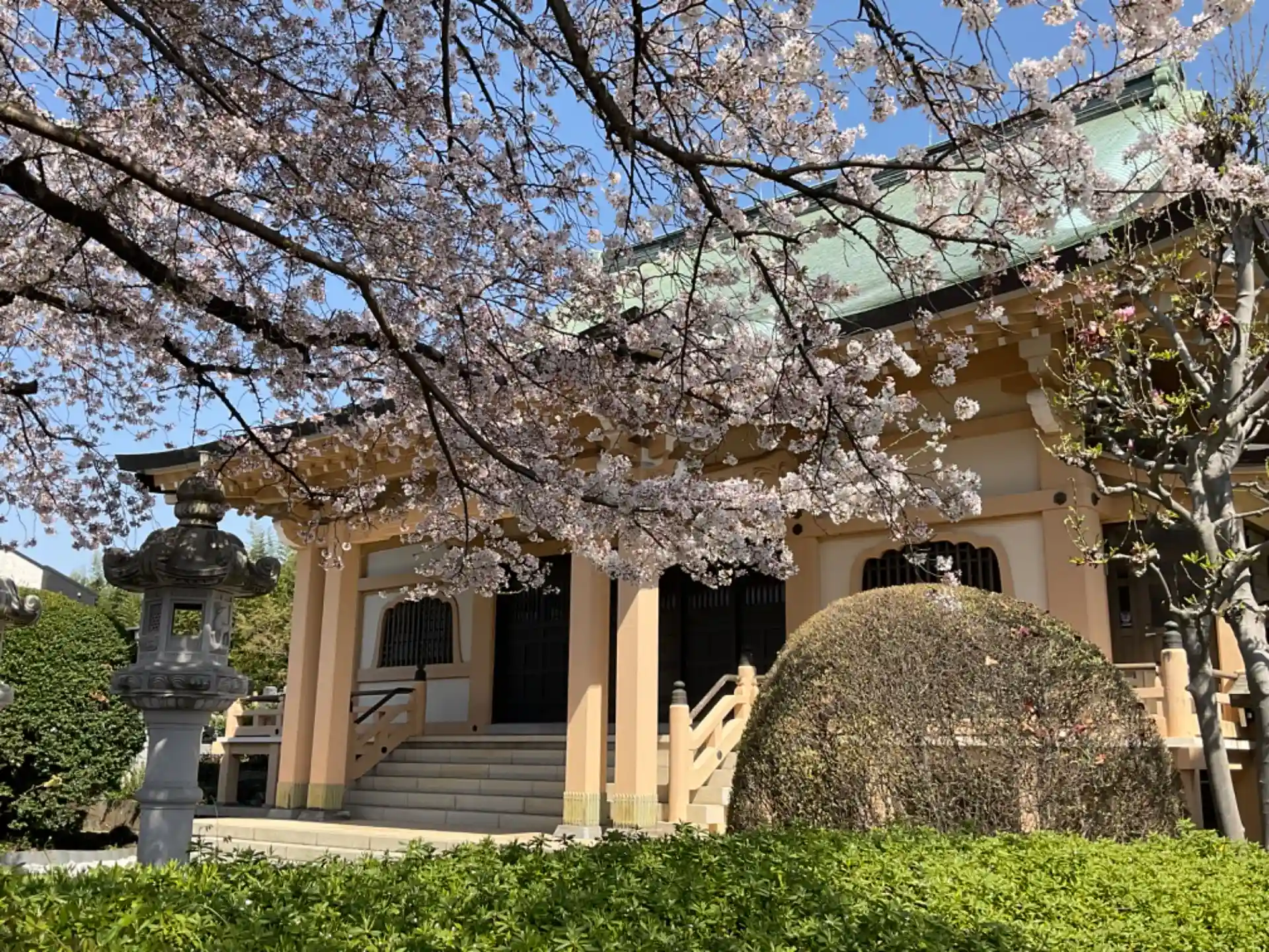 桜を背景に本堂が正面にあります。
