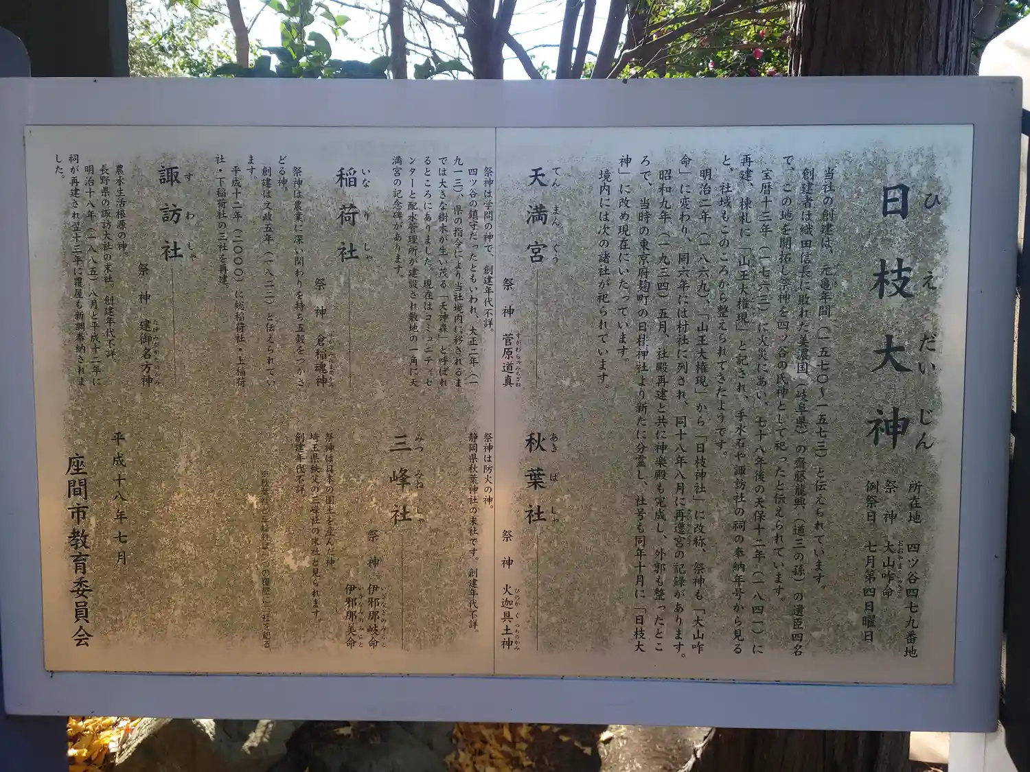 その後修理復元してきたが年を経るに従い増大する危険を慮り、昭和五十三年四月吉日に再建いたしましたのでこれを記念し旧鳥居を保存するものであります。
