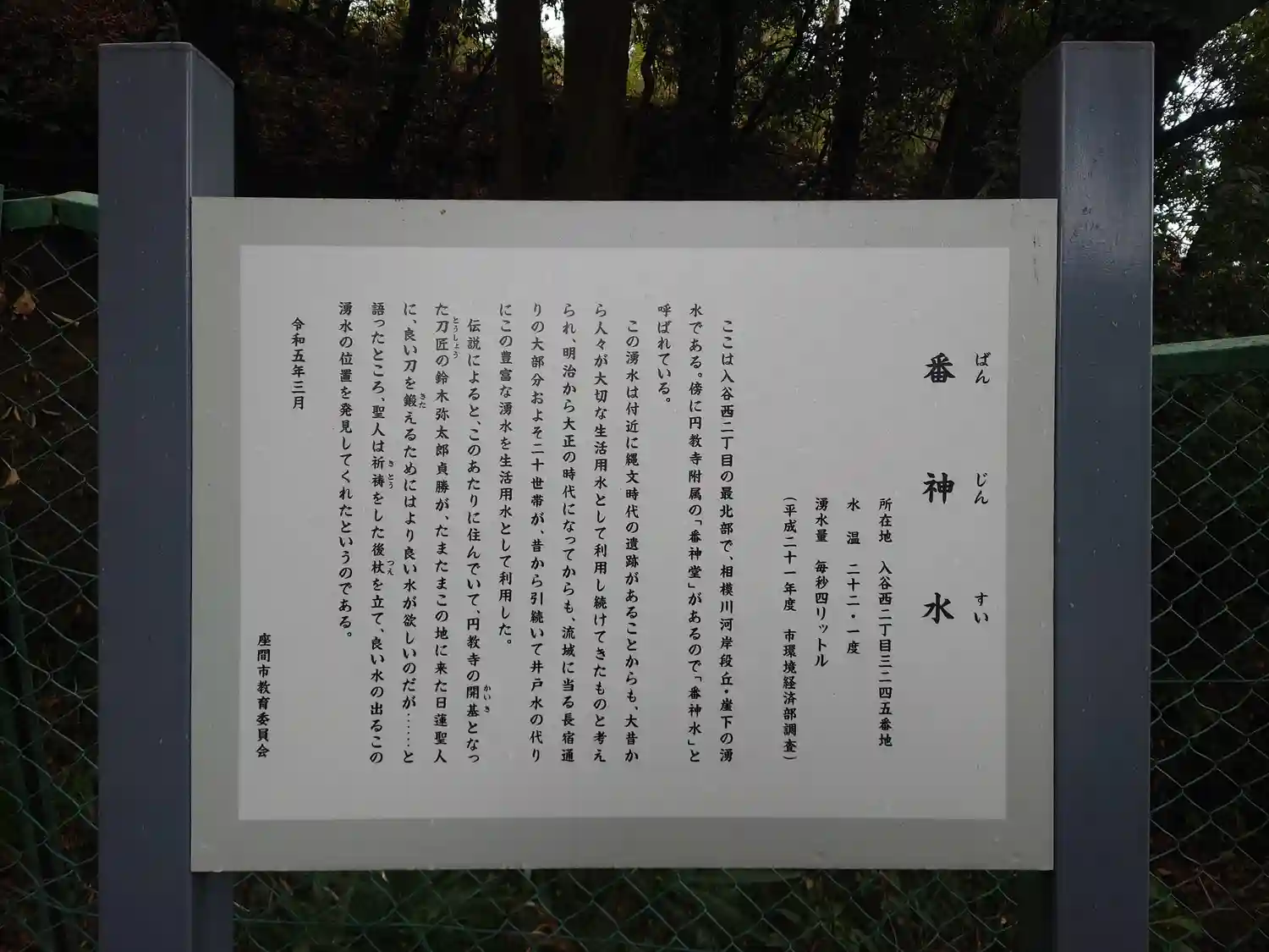 このお水を使って立派な日本刀が鍛えられました。また、昭和の初期頃までは下宿の酒造店が酒を仕込む時にこの番神水を使っていたそうです。