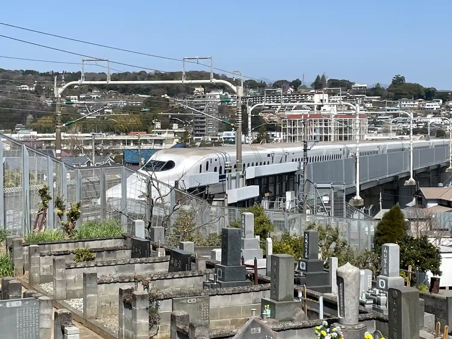 寺院の裏手を新幹線が走り抜けています。