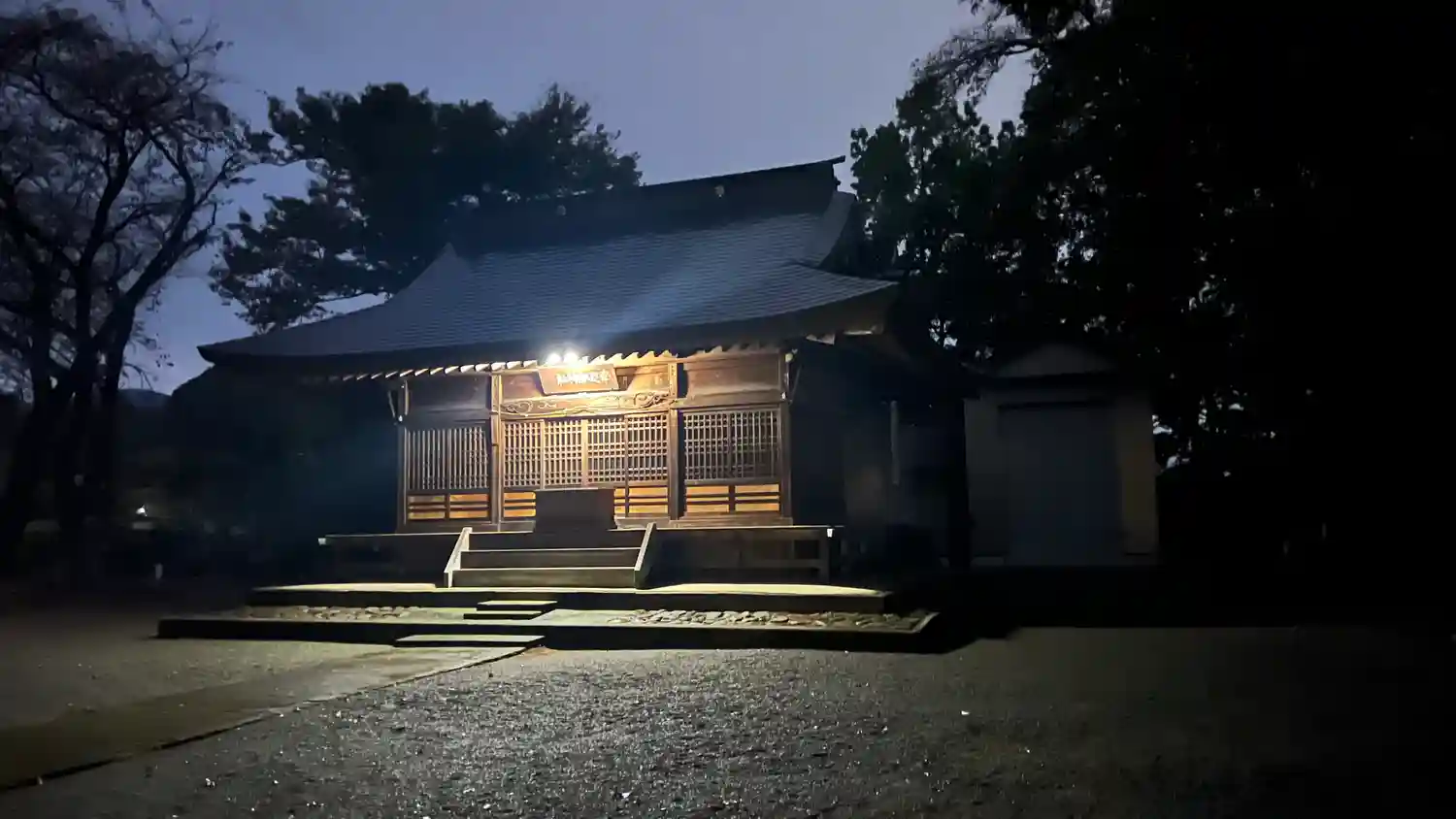 参拝時はすでに陽が落ち、周囲はすっかり闇に包まれていました。境内は石畳と玉砂利で構成されており、玉砂利の上を歩くと「しゃりしゃり」と耳に心地よい音が響きます。それに対して石畳の上では足音が吸い込まれるように静まり返り、夜の神社特有の厳かな空気を一層引き立てていました。社殿に掲げられた扁額には、右から左へと「南足柄神社」と記されており、薄闇の中に浮かび上がるその文字を見つめた瞬間、改めて自分が南足柄という地に立っているのだという実感がこみ上げてきました。