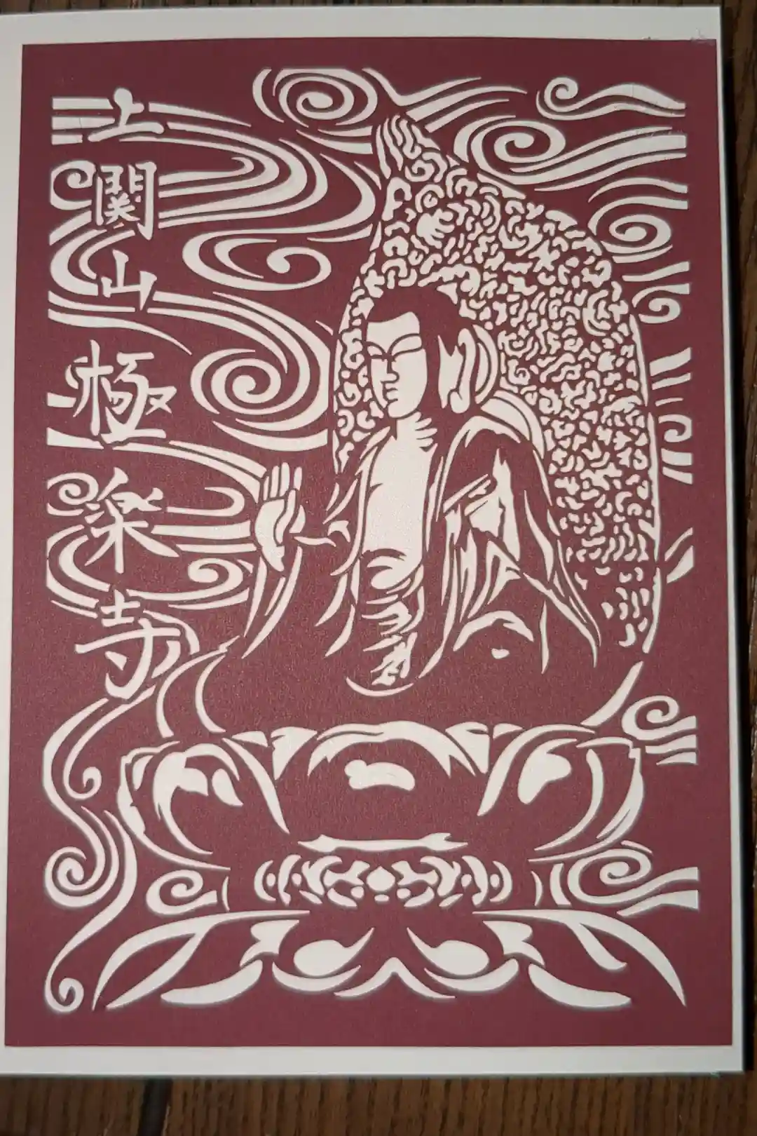 全て手作業の1点ものの切り絵です(写真は切り絵作品です。限定御朱印の切り絵は坐禅の姿になる予定です)