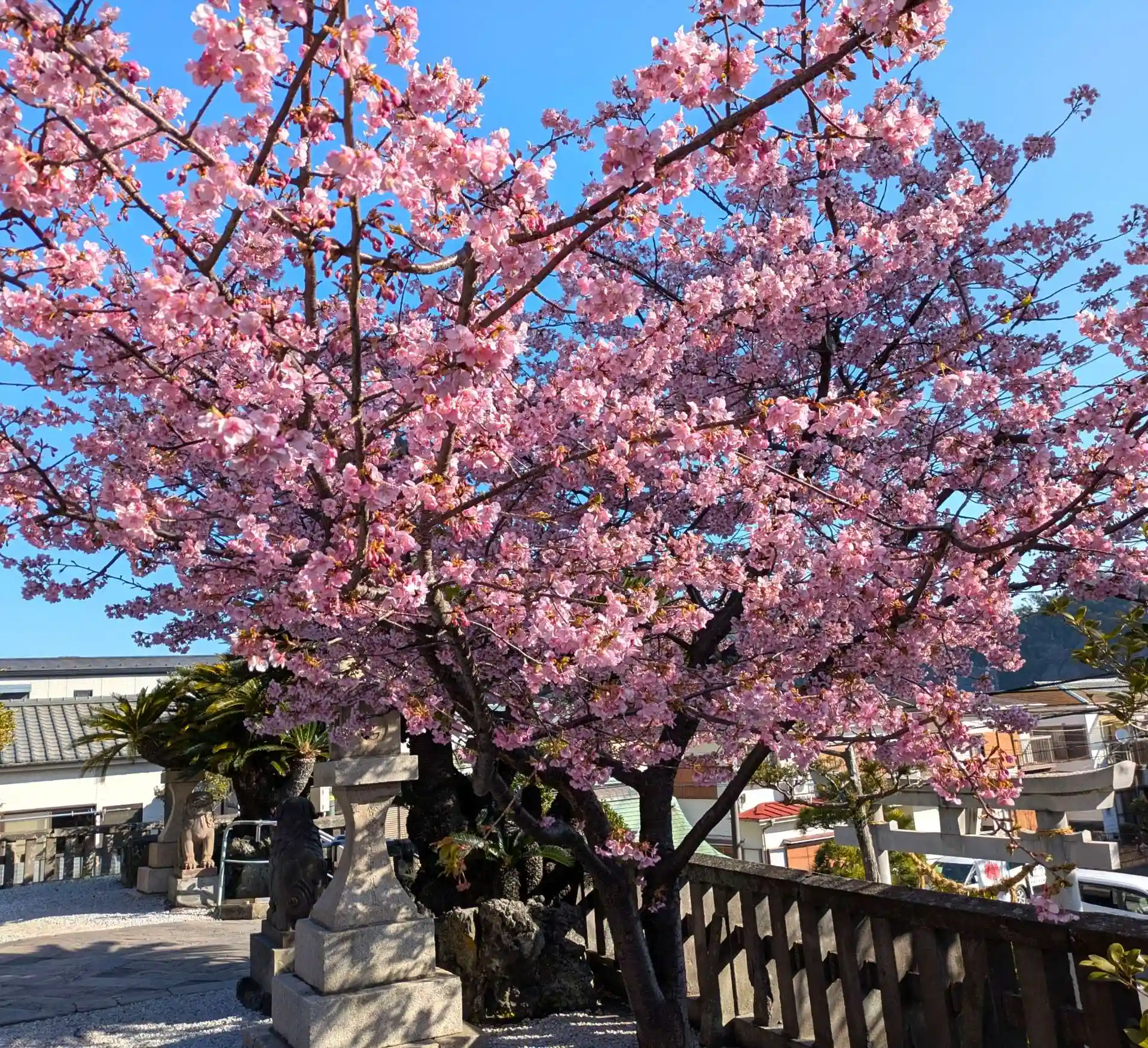 本殿。後ろも河津桜?
