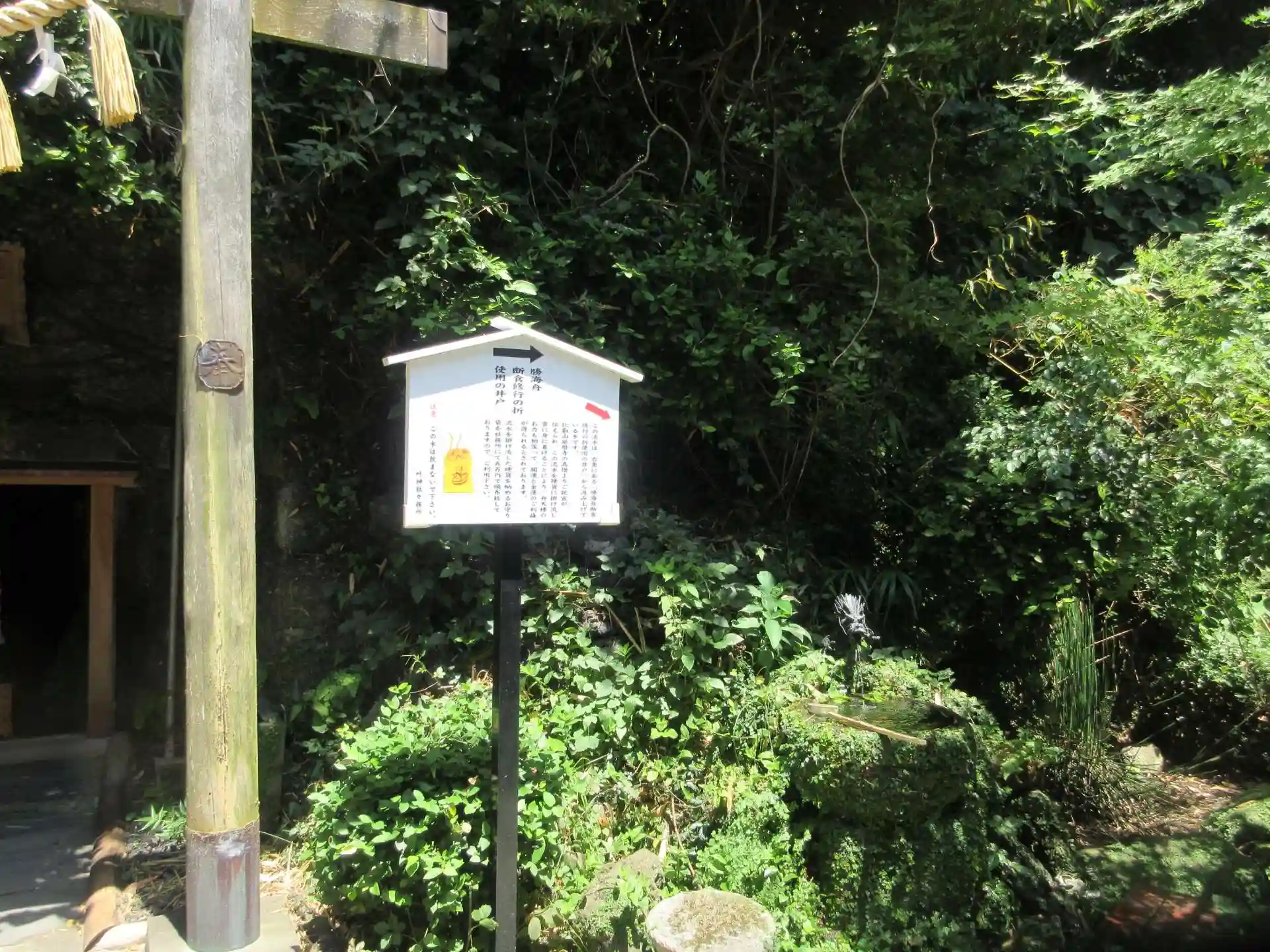万延元年(1860)、時の幕府は日米修好通商条約批准交換のため米国軍艦ポーハタン号随行船としての咸臨丸の 船将に任命された勝海舟は壮挙に先立ち当社を訪れ太平洋横断公開の一路平安について叶神社の加護を記念し併せて事故の精神的肉体的荷重等の克服を謀るため社内にある井戸水で 潔斎水垢離を済ませ修行用の法衣に心身を整へ千古鬱蒼とした樹林に囲まれた輿の院の社前のこの場所を選んで座禅を組み断食修行を行ったのである。