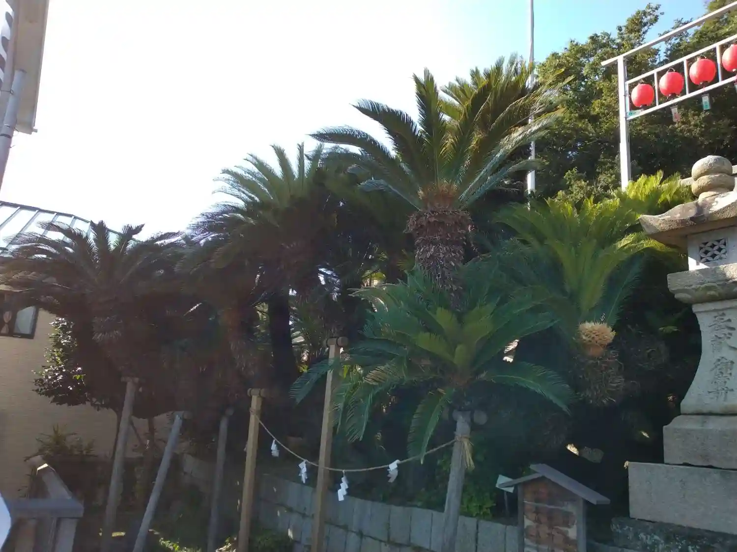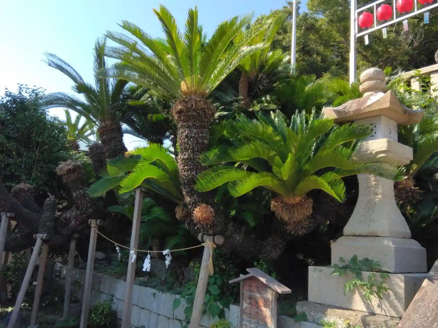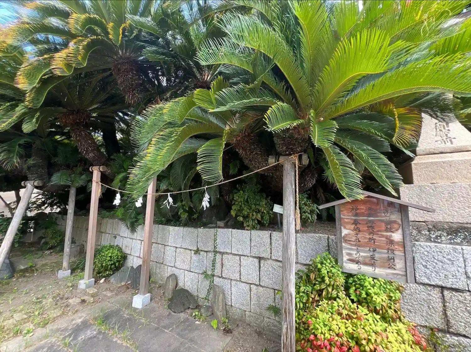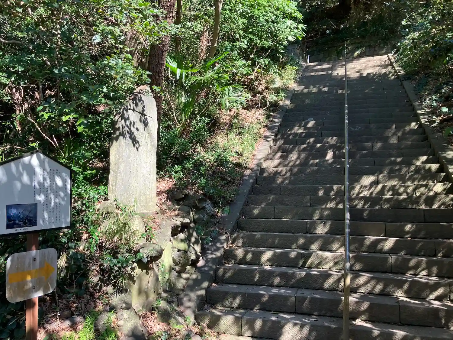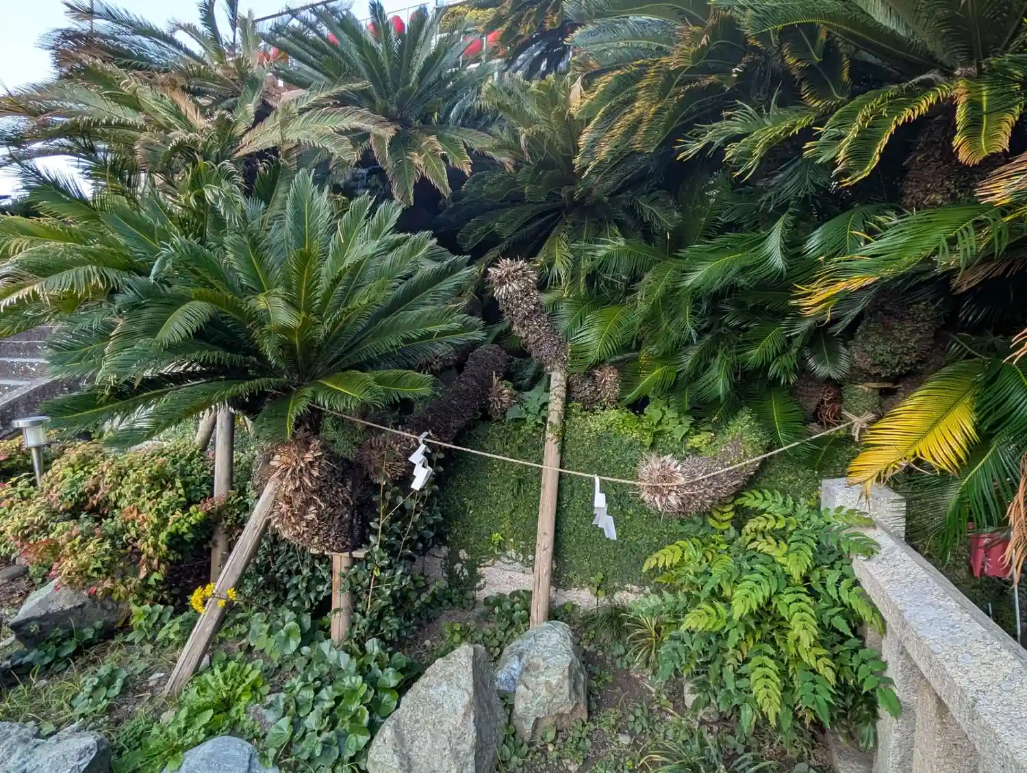 07-1) 「東叶神社」社殿への参道階段。階段中腹の平場には、’ 源頼朝公が移植奉納の蘇鉄(ソテツ) ’。