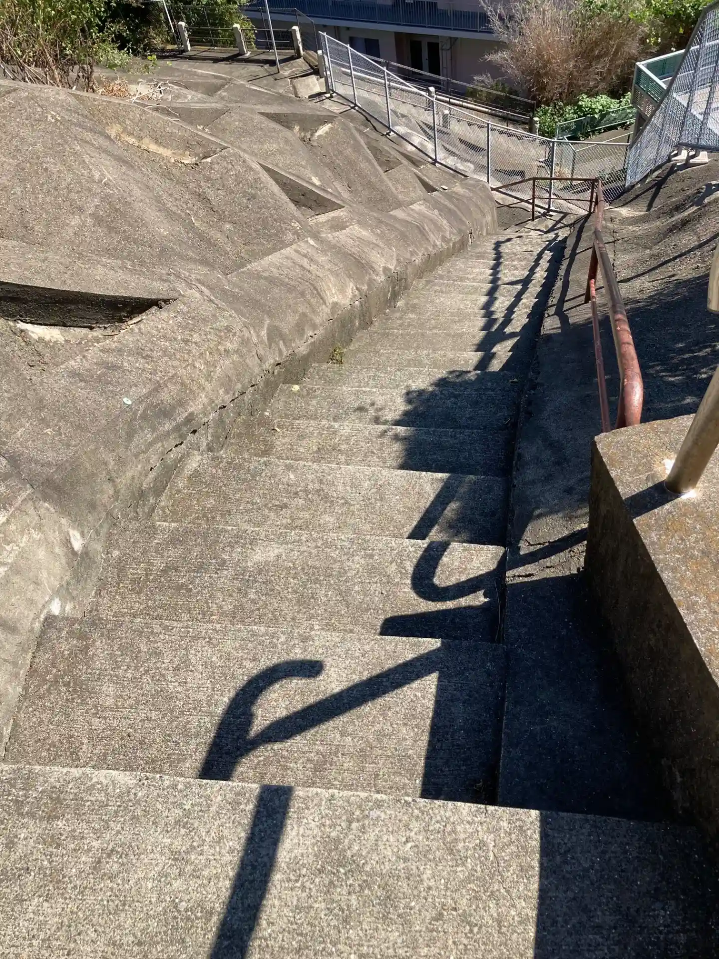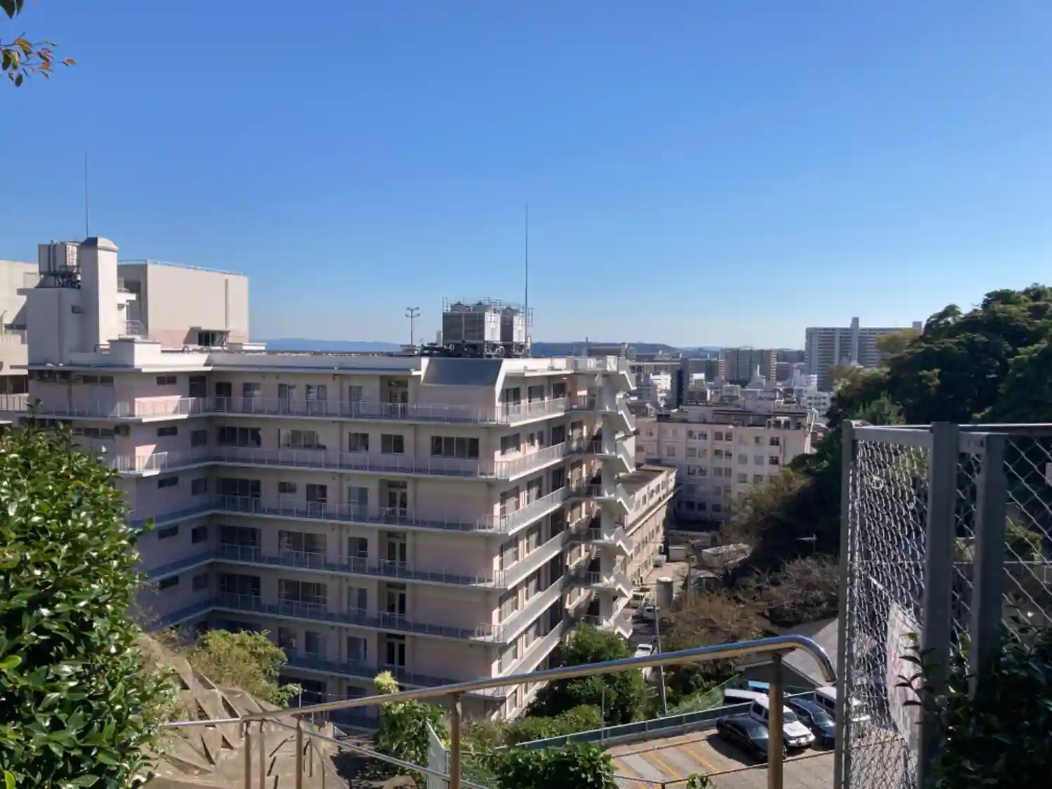 01-3) 一応の階段頂上から、覆い被さるように見える高層集合住宅。