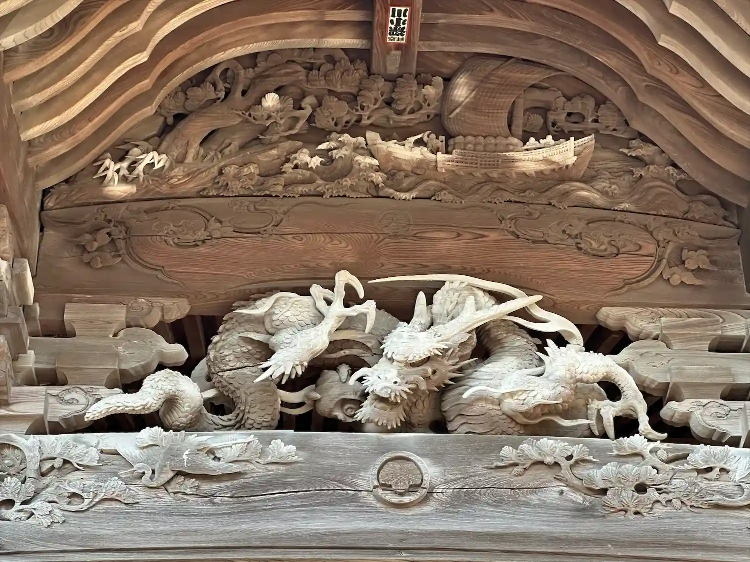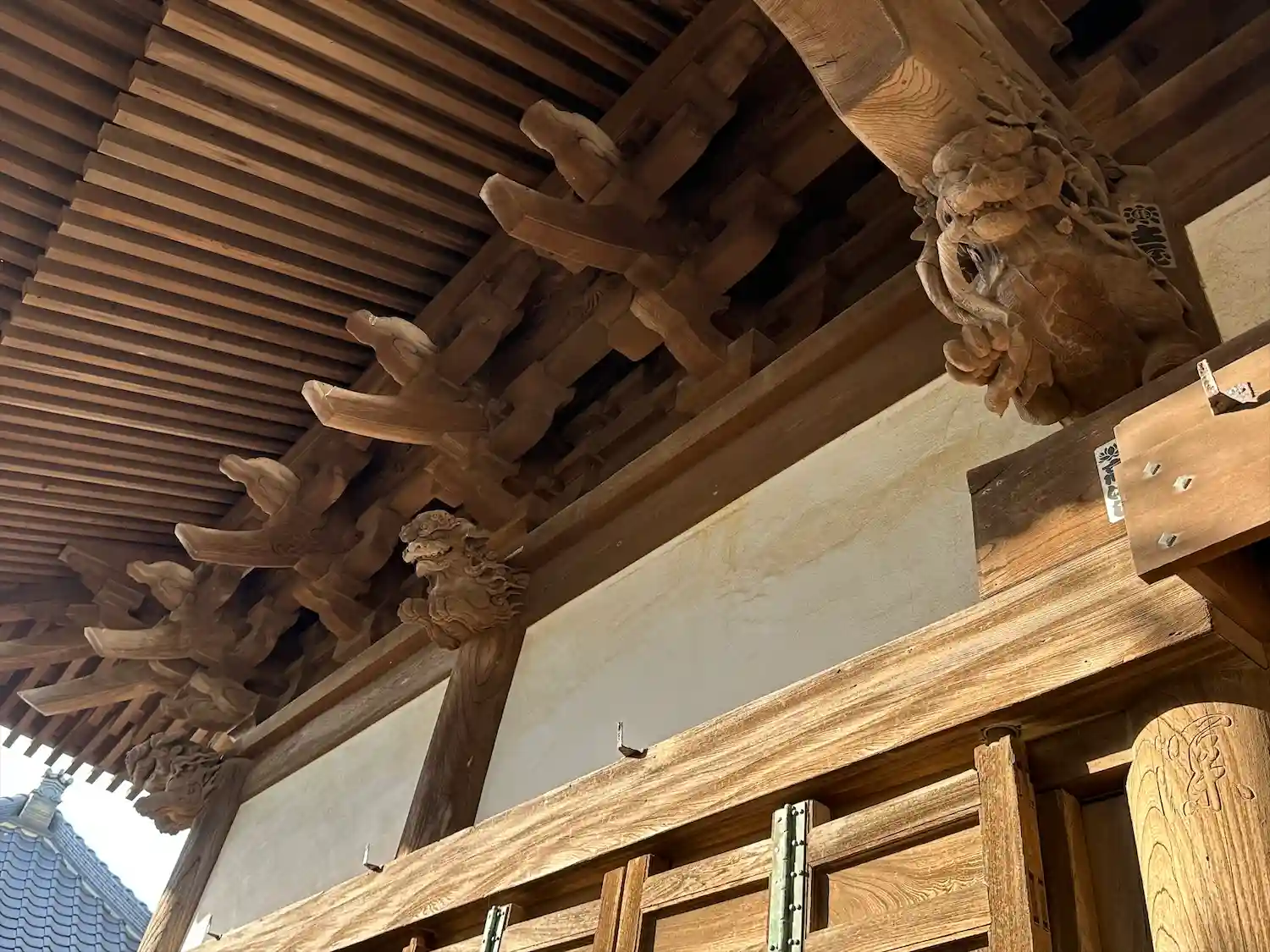 前面も側面の木鼻にも彫刻がある。