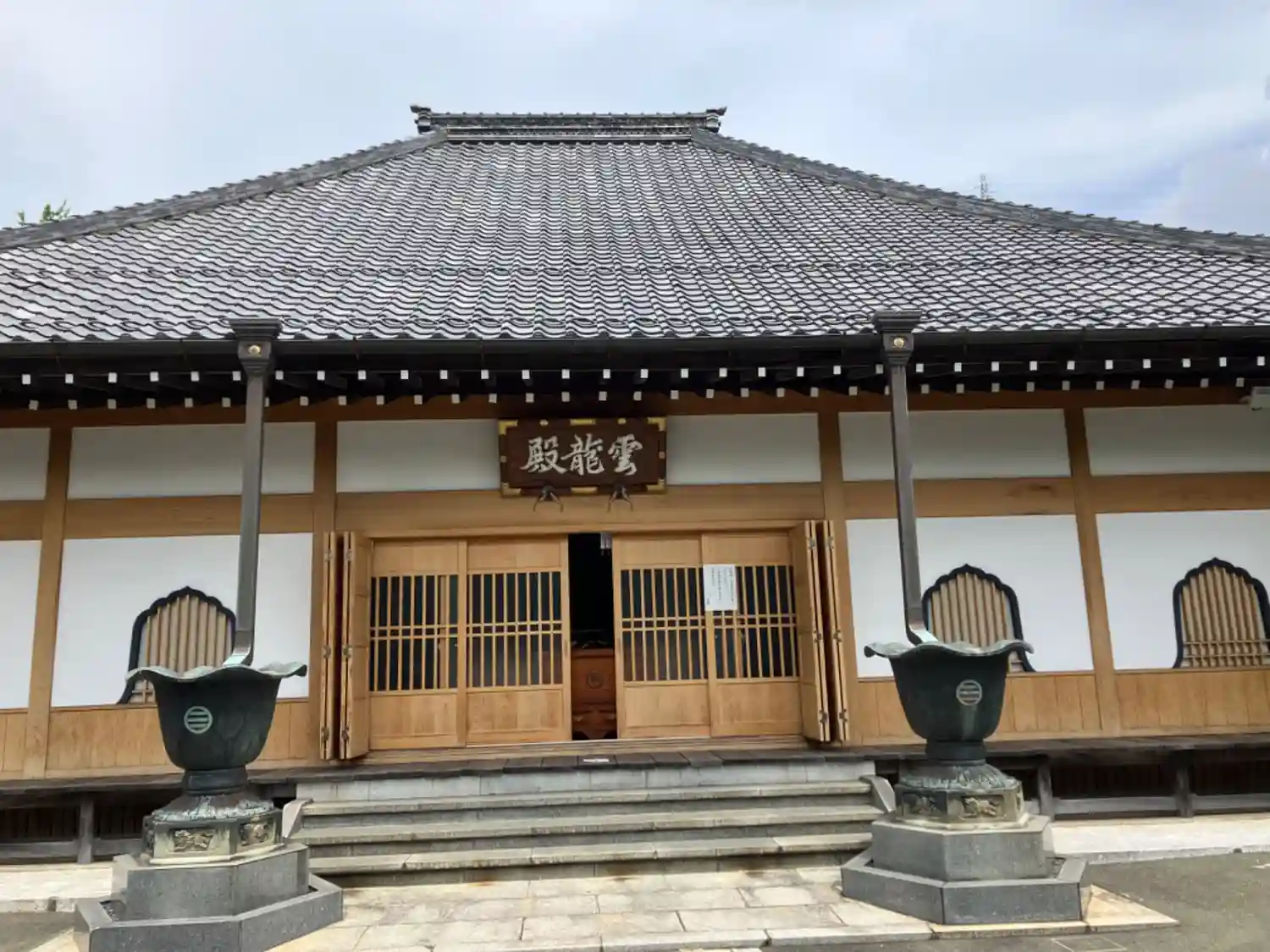 本堂、正面にテントがあり斜めから撮影