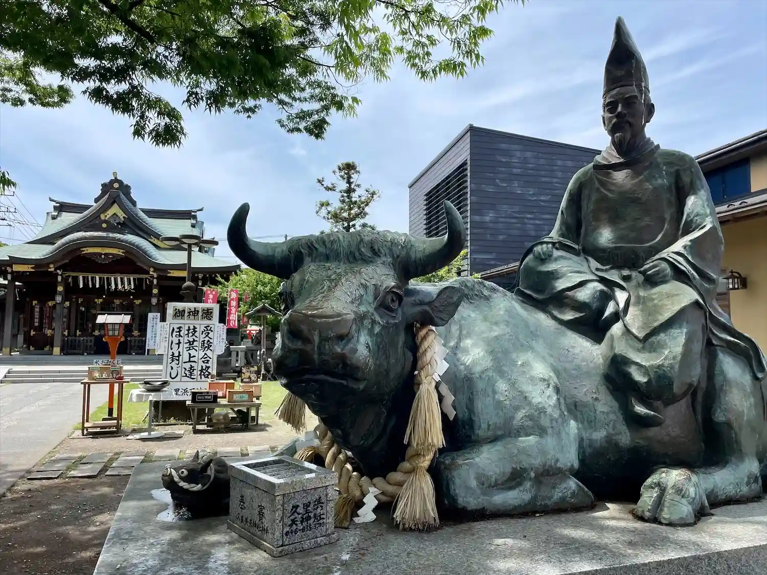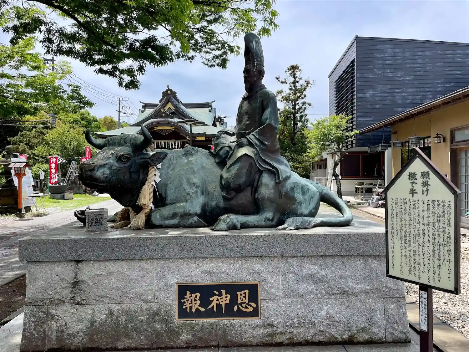 久里浜天神社に鎮座する「菅公騎牛像」。その名の通り、菅原道真公が牛にまたがる姿をかたどった銅像であ…