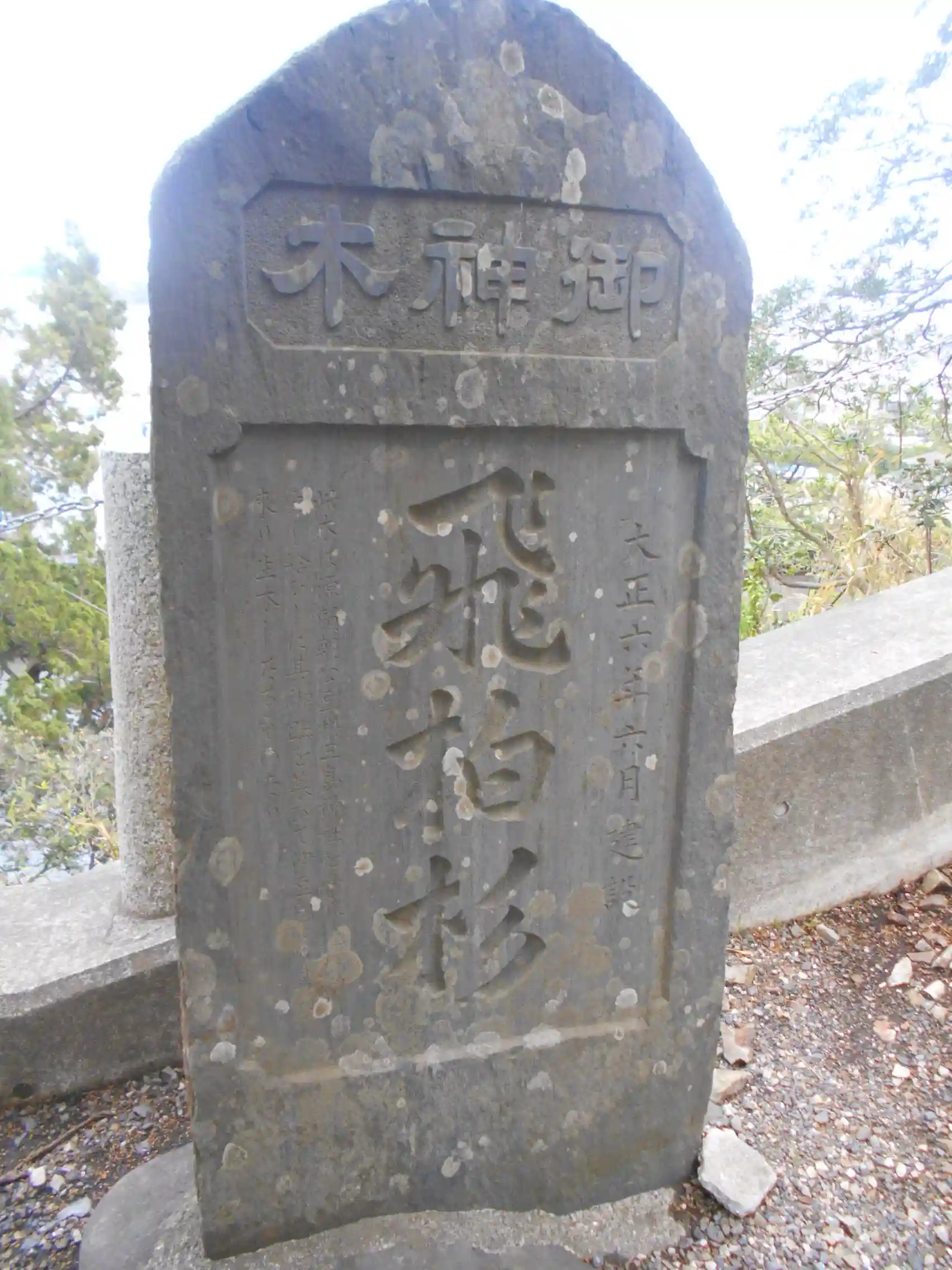 手前:石碑(碑文:御神木 飛柏杉)