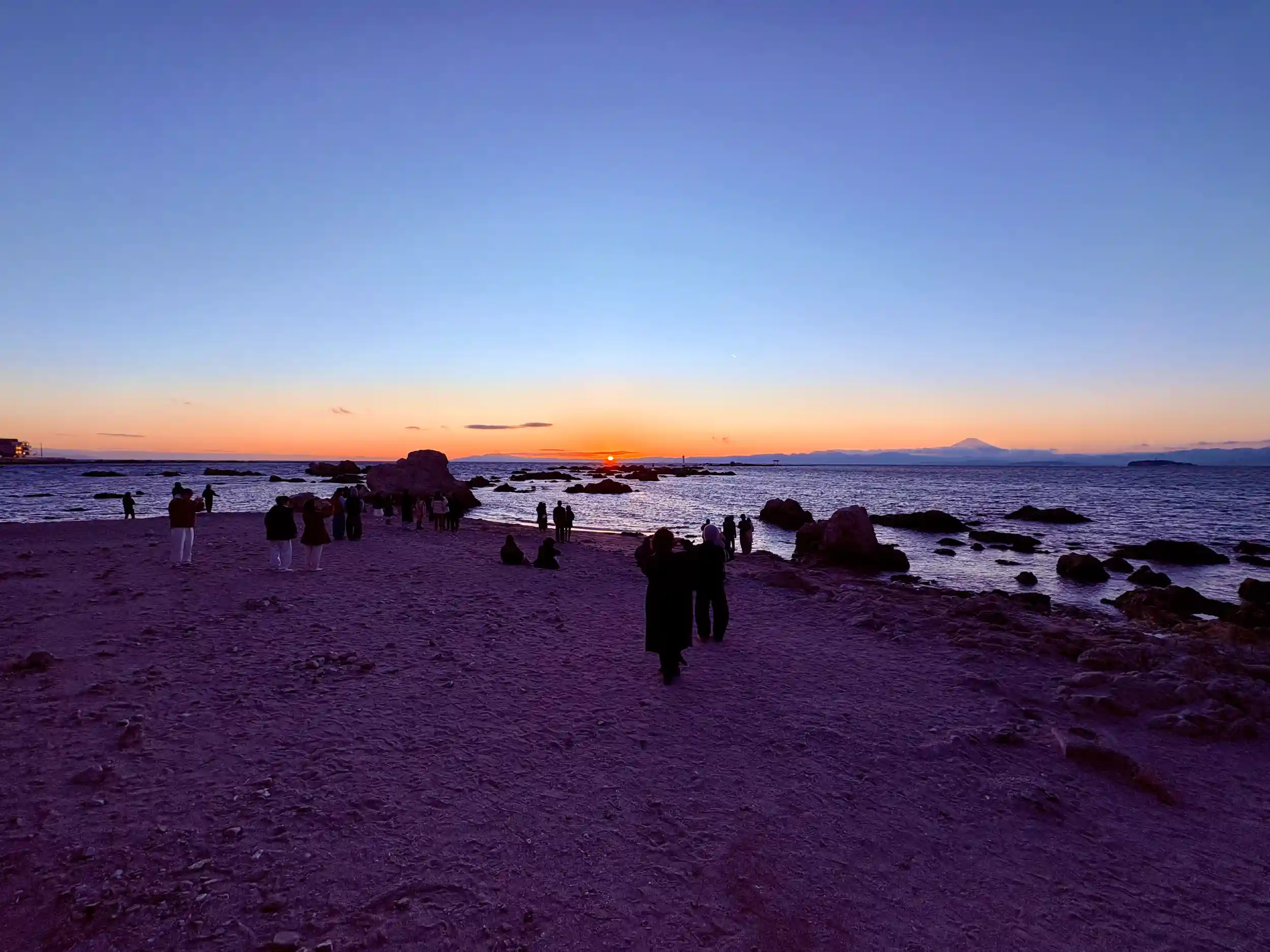 日の入り時間となり、地平線に沈む太陽を見つめながら、この一年無事に過ごせたことを感謝しました。