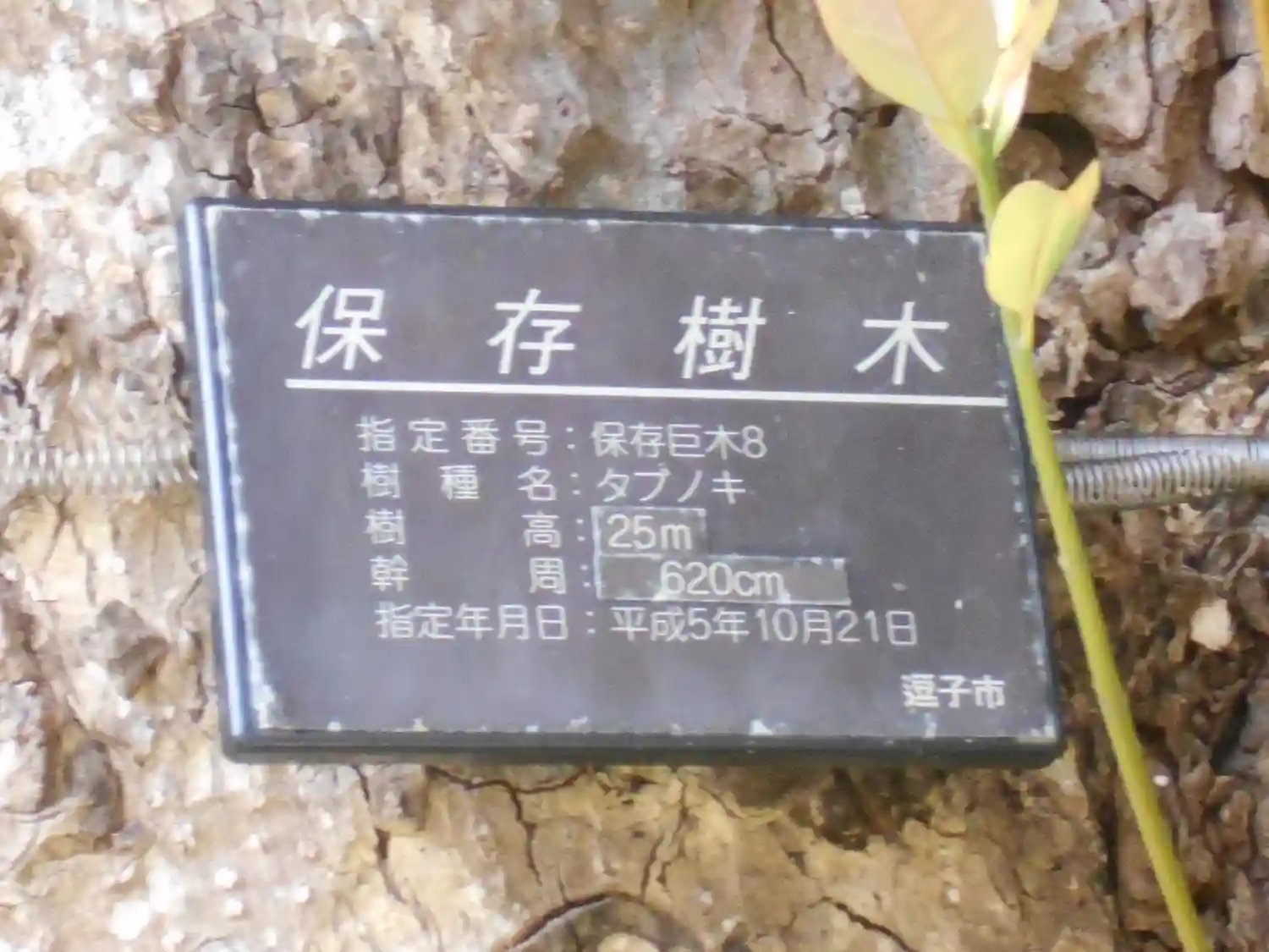 ” 保存樹木 ” のプレートが添えられたタブノキ(椨の木)