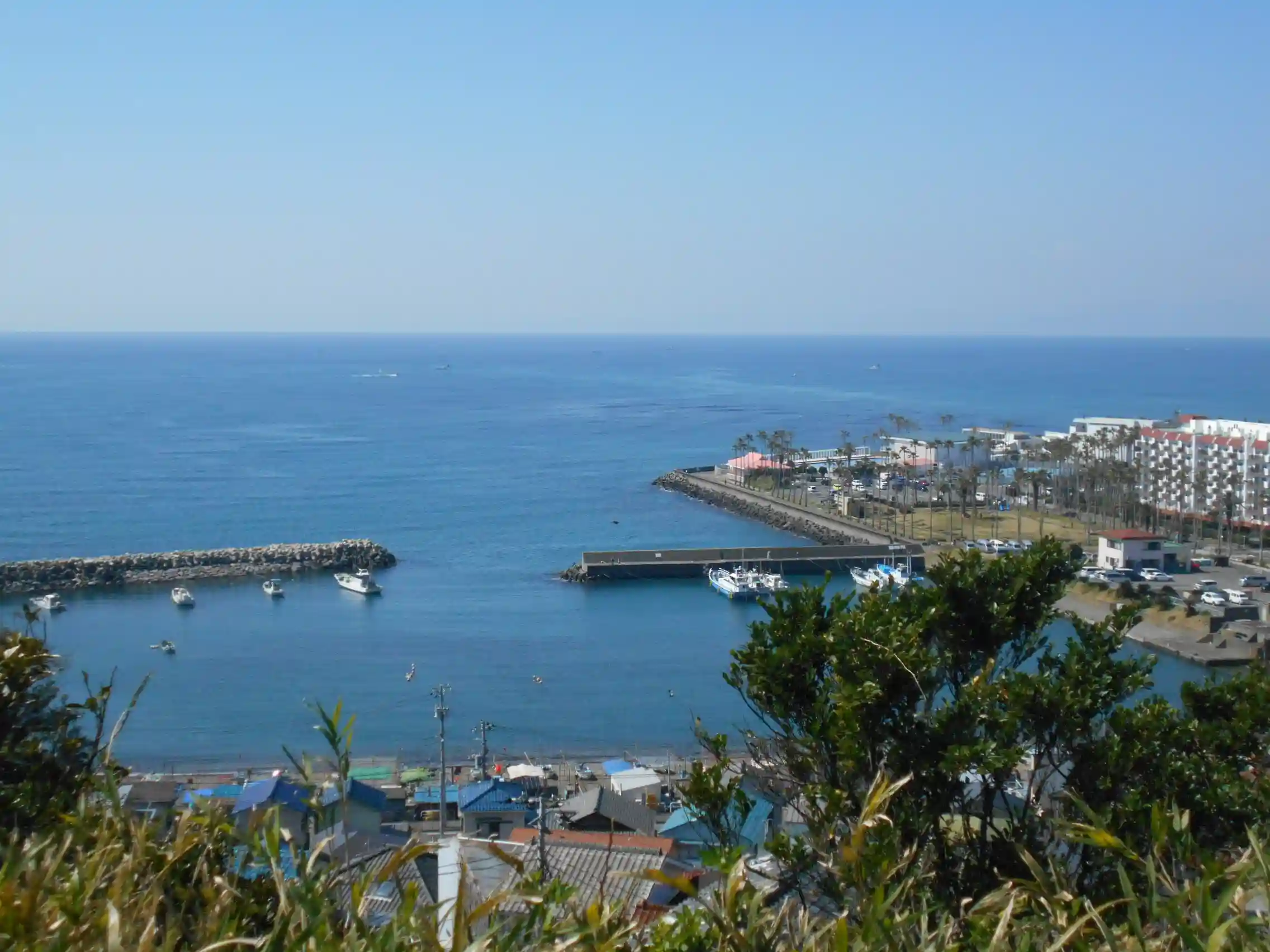 00-4)「天照大神社」裏参道鳥居周辺から眼下の小坪漁港 ~ リヴィエラ逗子マリーナ東端のプールがある区域。