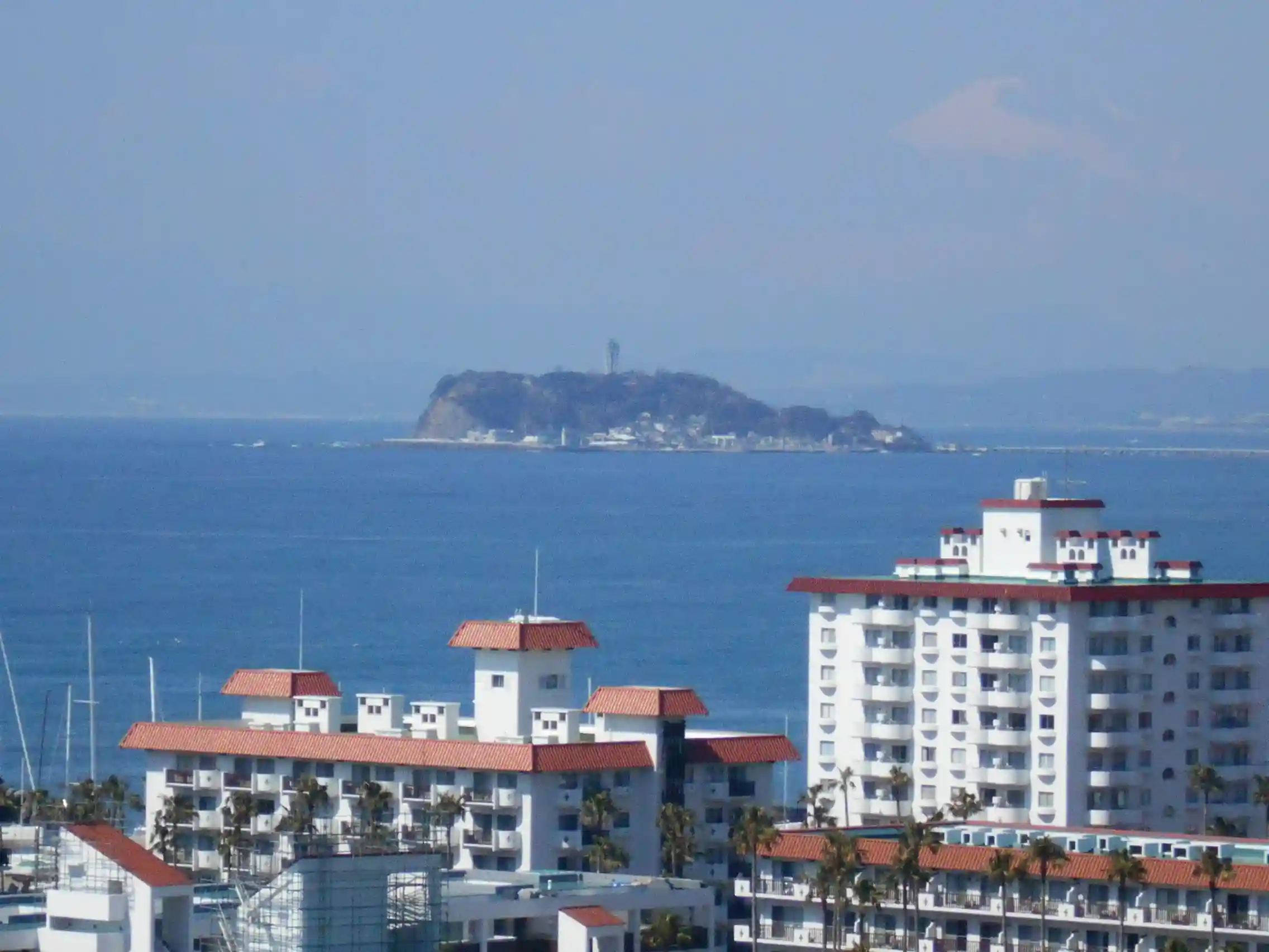 手前:リヴィエラ逗子マリーナ、奥:江の島