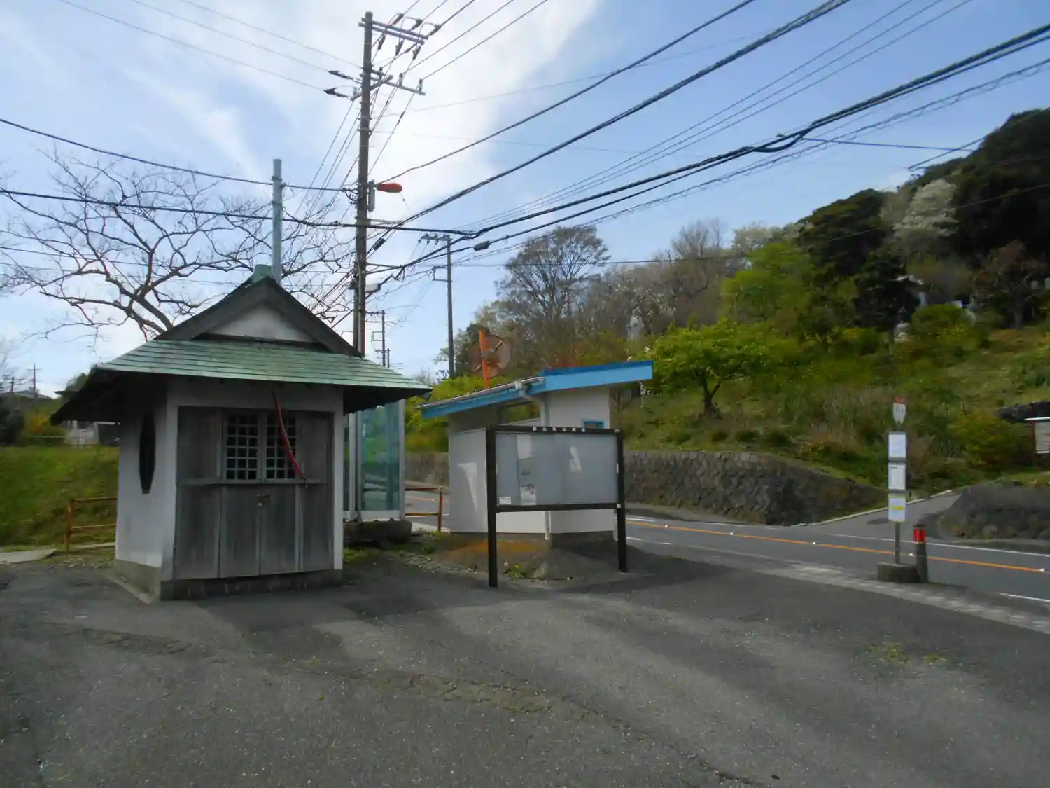 写真右の停留所標識向こう側の坂は通用口で、