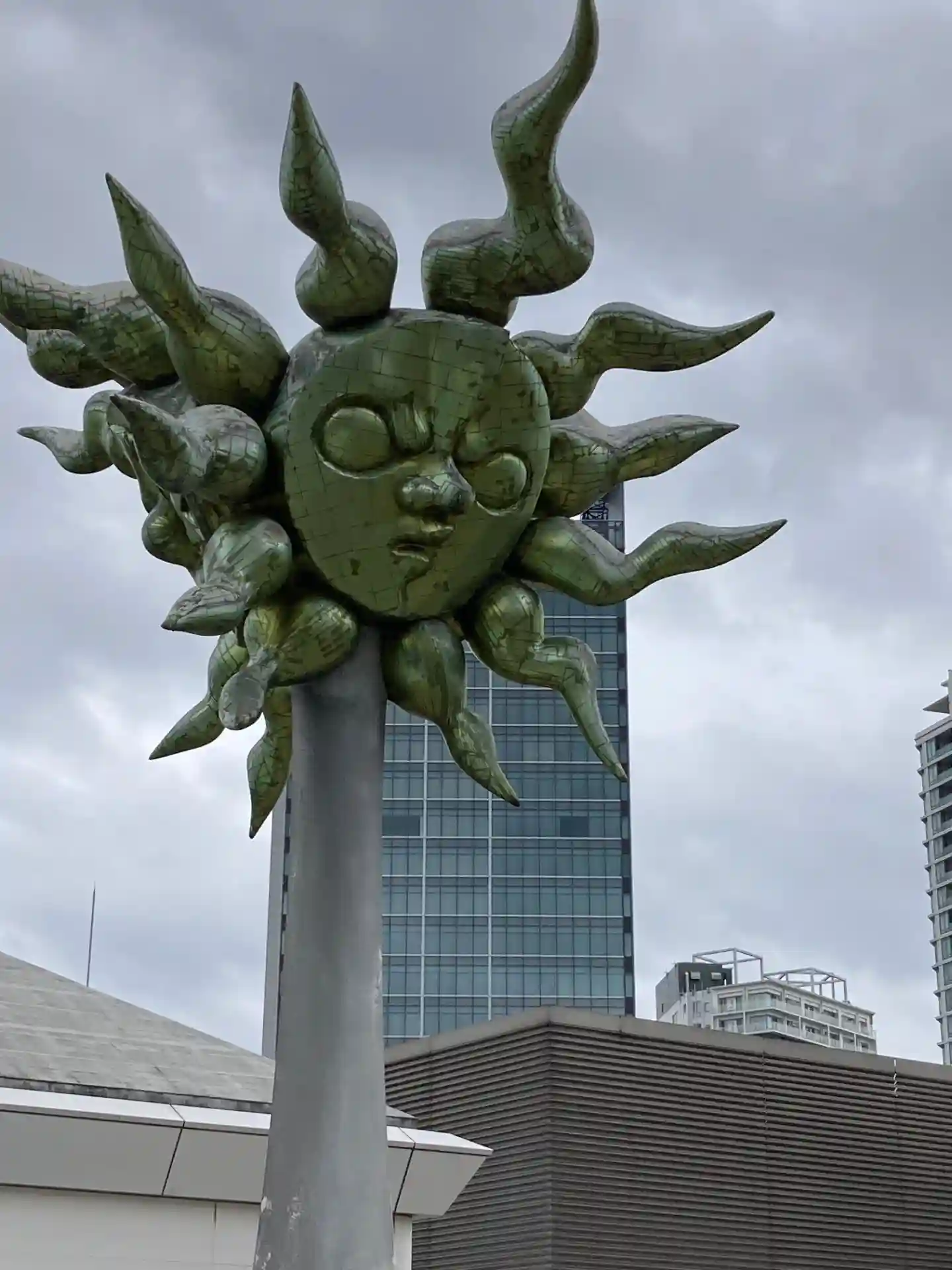 「太陽」岡本太郎✨ 大阪万博(1970年)の会場に設置された、岡本太郎氏の作品「太陽の塔」を連想させる太陽の顔。こちらは、そごう横浜店開業(1985年)に合わせて、岡本太郎氏が新規にデザインした「太陽」という別の作品になります。
