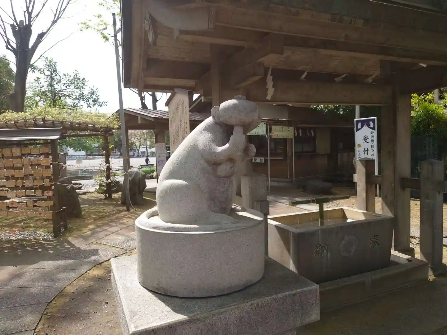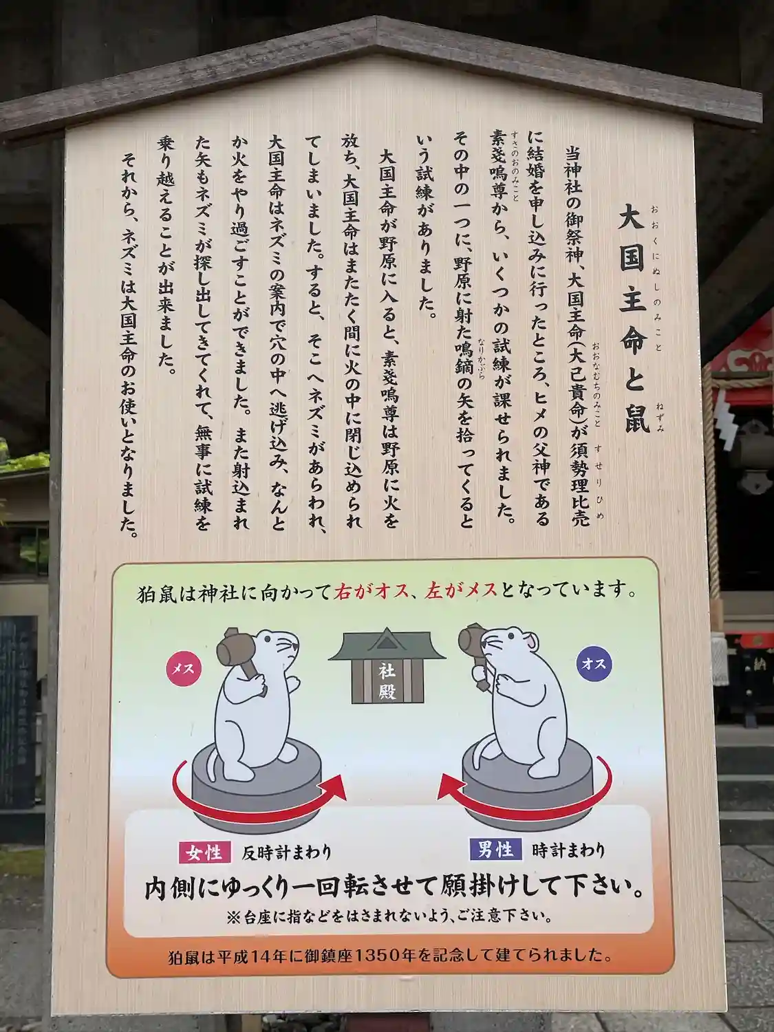 ねずみさんの石像が左右に二体あり、左が女性用、右が男性用。石像を境内に向けて内回りにゆっくり一周す…