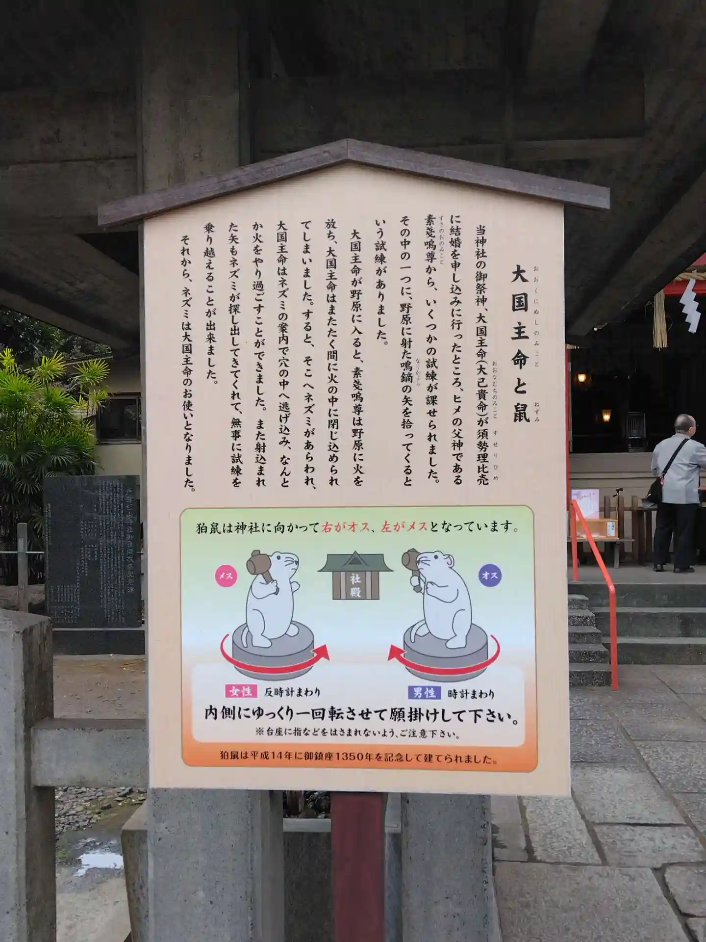 狛犬ならず、見えにくいですが狛ネズミです。ネズミの下の石が回るようになっていて、男性は右側のネズミ…