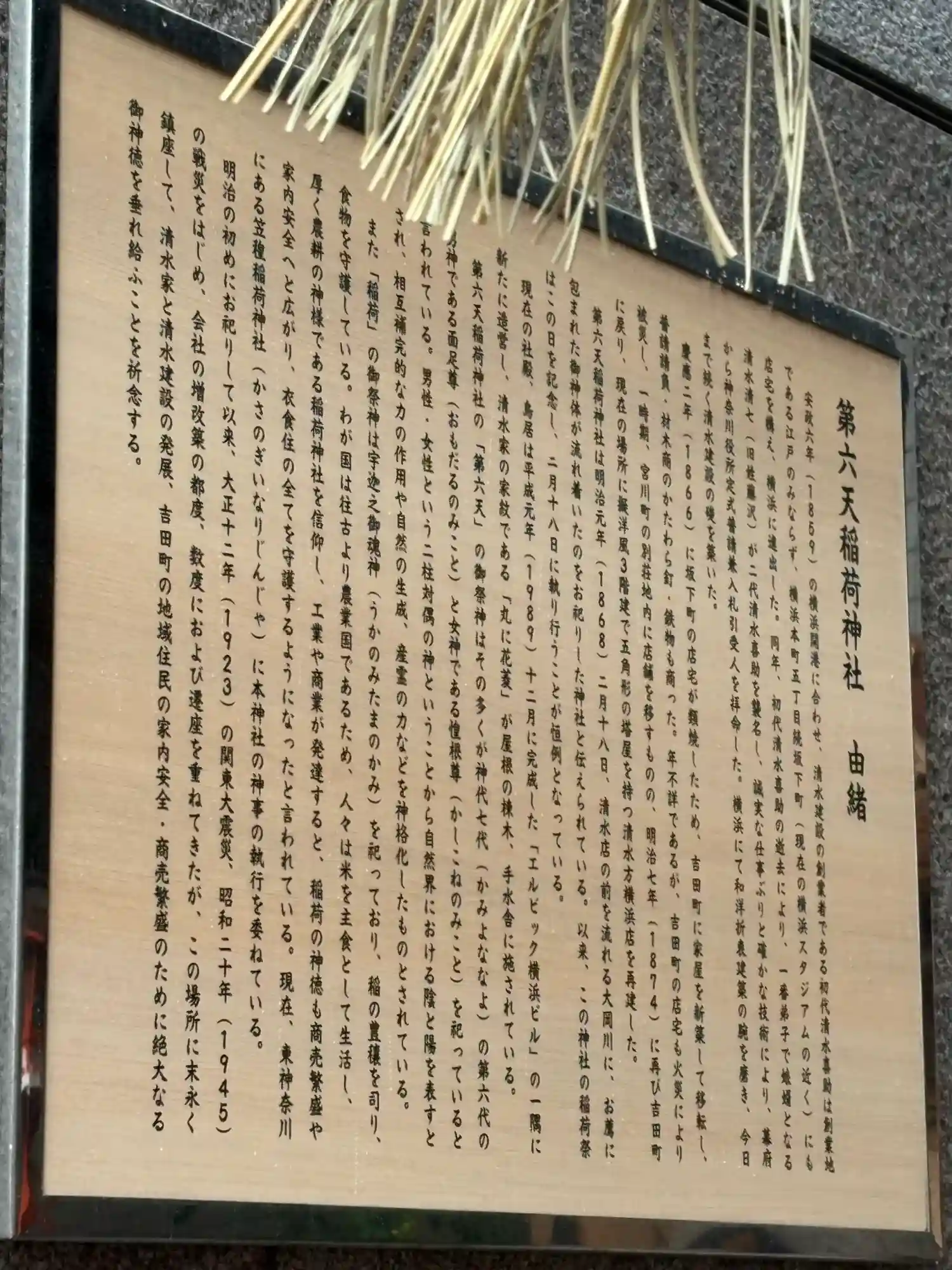 明治元年(1868)現在の大手ゼネコン清水建設が、当時横浜に店を構えていたこの地にご神体が流れ着いたことから、二代目社長の清水喜助により、この地にお祀りされたのが始まりとのことです。