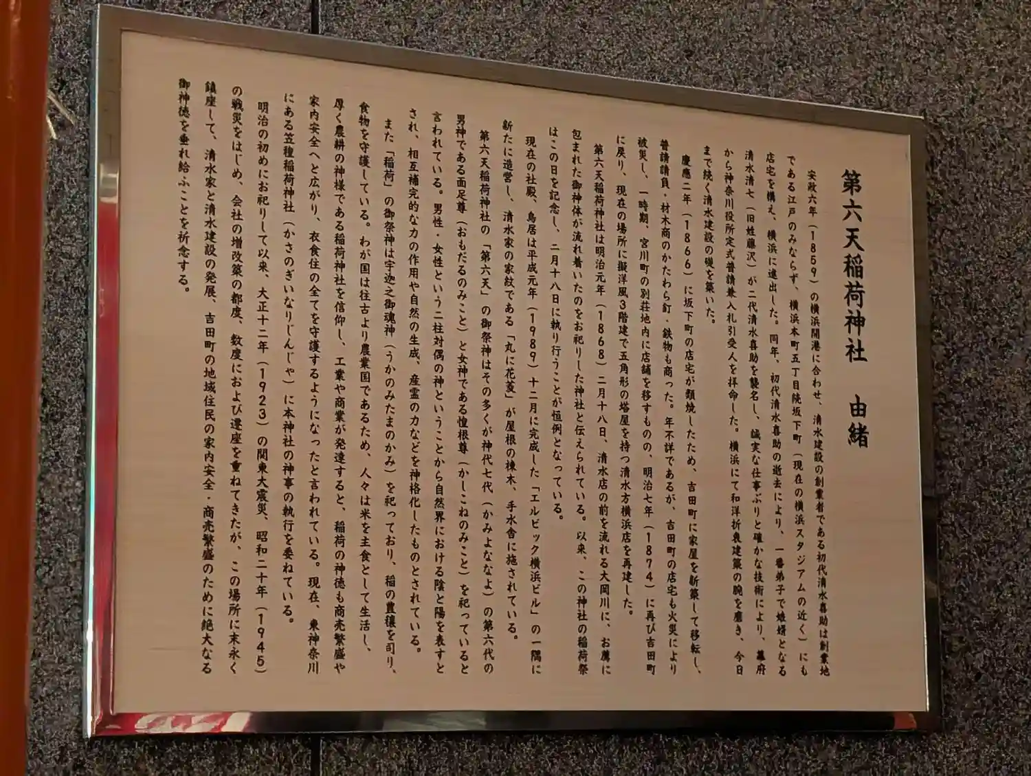 明治元年(1868)現在の大手ゼネコン清水建設が、当時横浜に店を構えていたこの地にご神体が流れ着いたことから、二代目社長の清水喜助により、この地にお祀りされたのが始まりとのことです。
