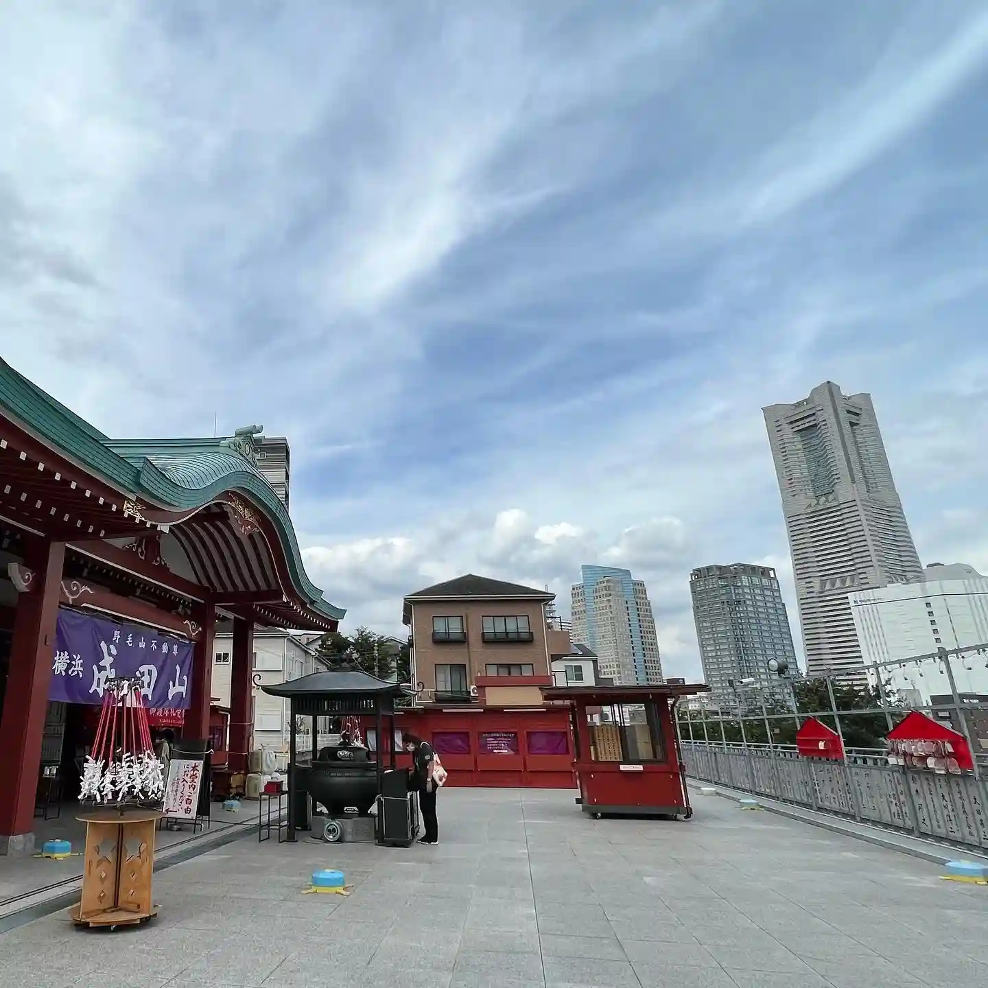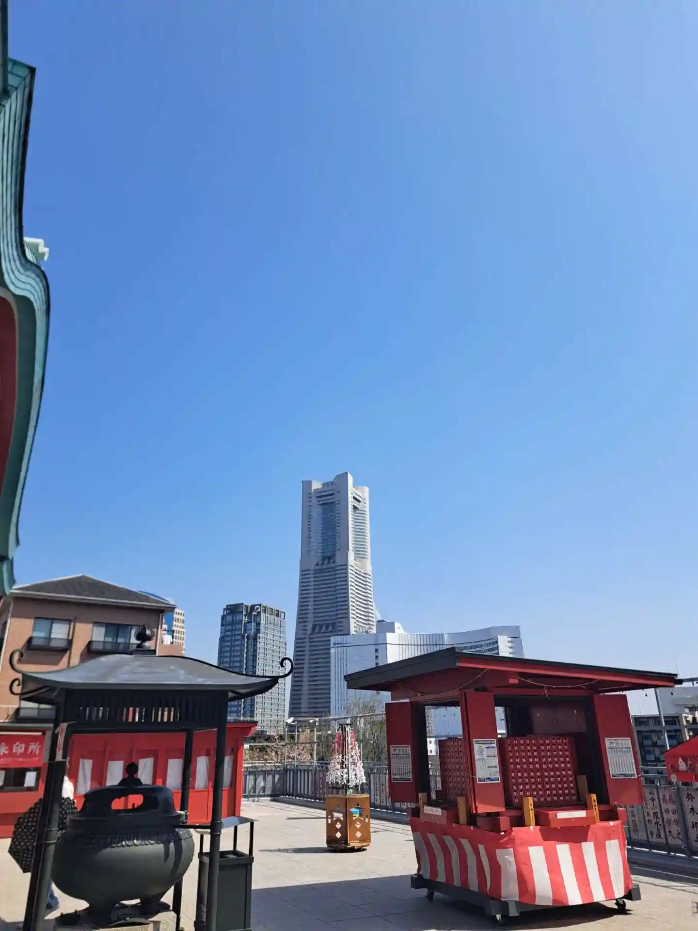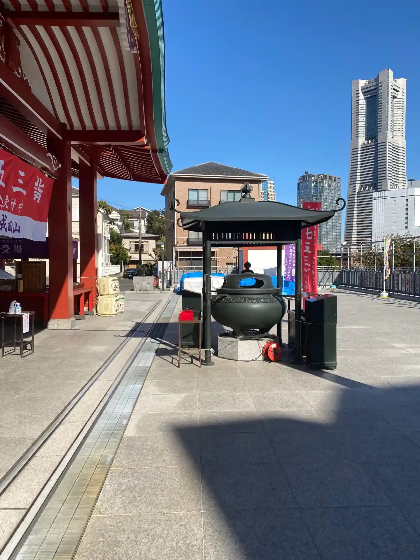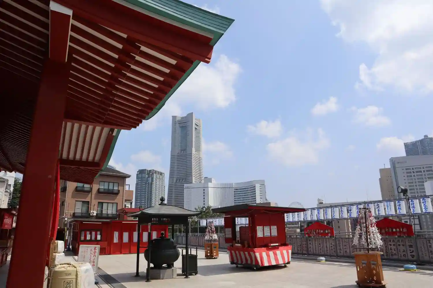ランドマークタワーとお寺の本堂とのコントラストも見所です。
