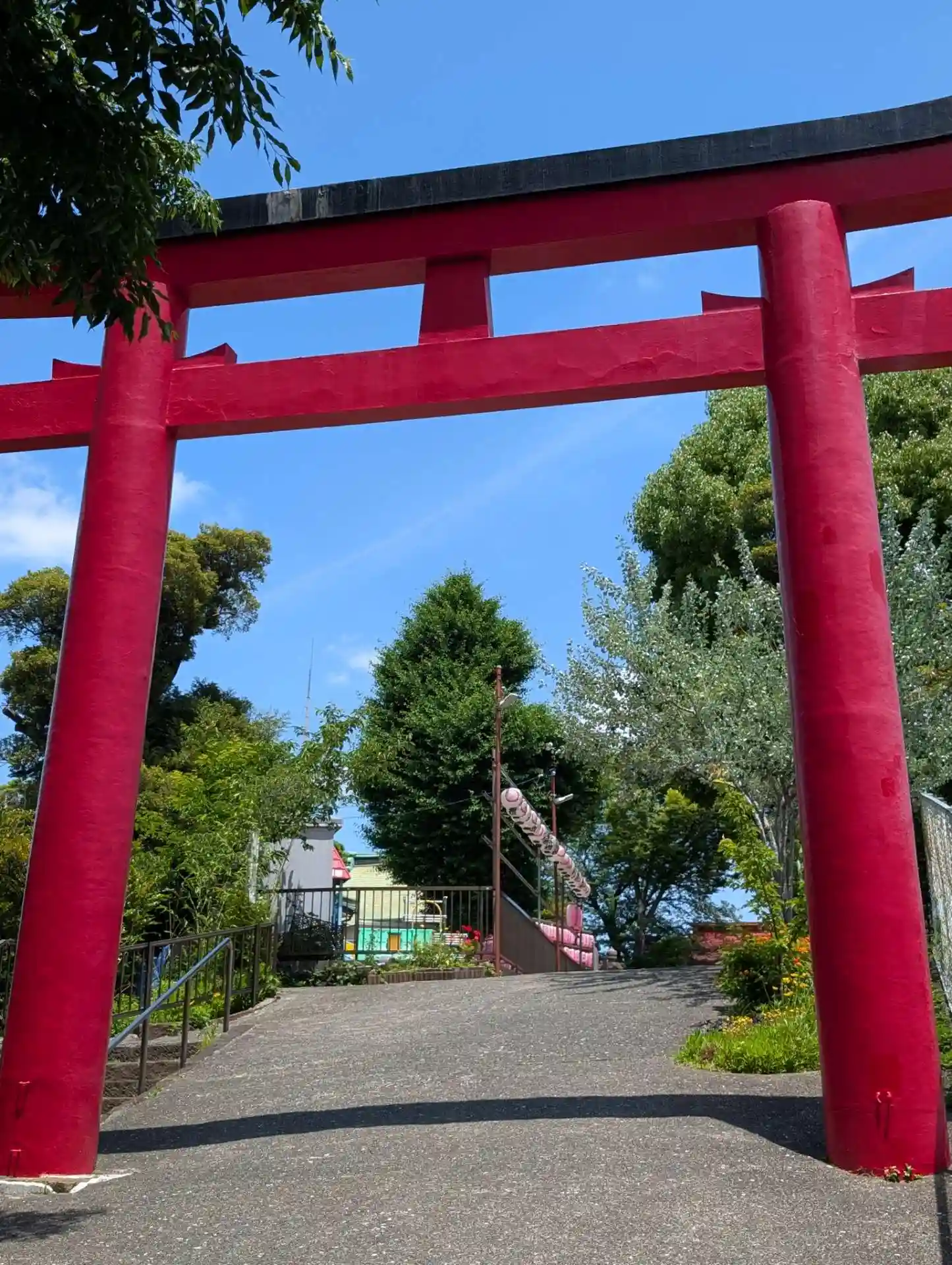 ここの赤い大きな鳥居にパワーもらっています。日月石灯籠から赤い鳥居眺めて見ました。
