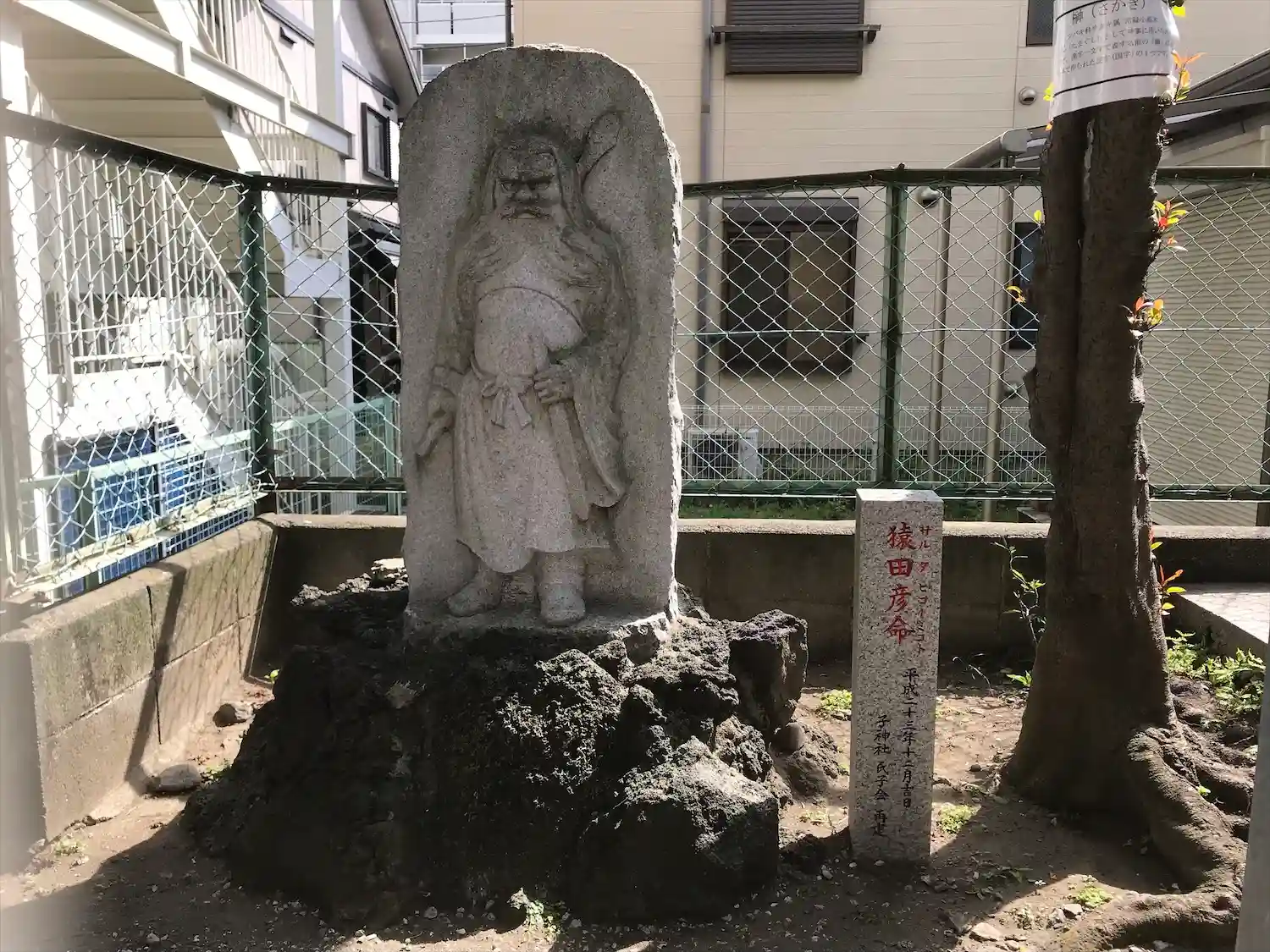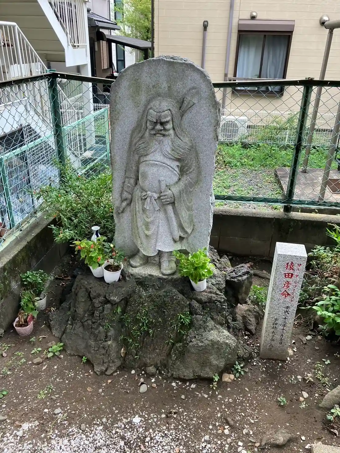 →当社では古くから道祖神を境内社として祀っていたたため、猿田彦命を祀る石像として再建された。(平成23年/2011)