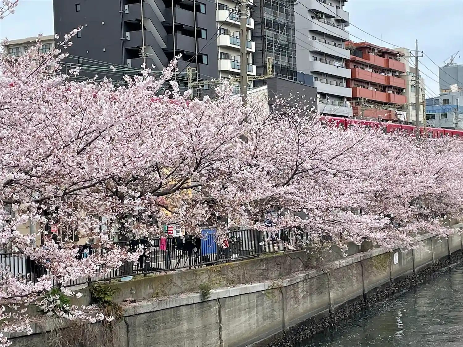 近くの大岡川沿いの桜🌸後ろに京急電車🚃