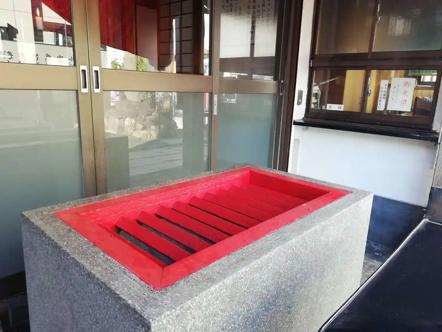お賽銭箱。お稲荷さんのような朱塗りです。