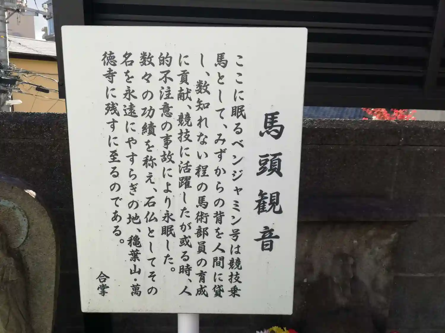 馬頭観音の説明。レース馬ではなく、オリンピック種目にある馬術の競技乗馬の馬だったようです。