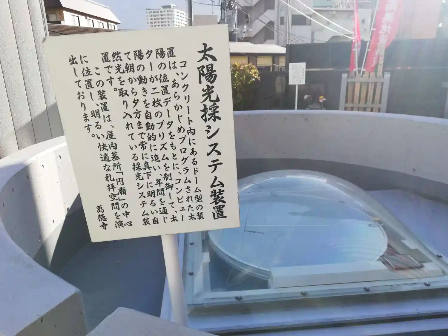 ストーンサークルの真ん中に下階の円廟に太陽光を取り込む装置がありハイテクです。
