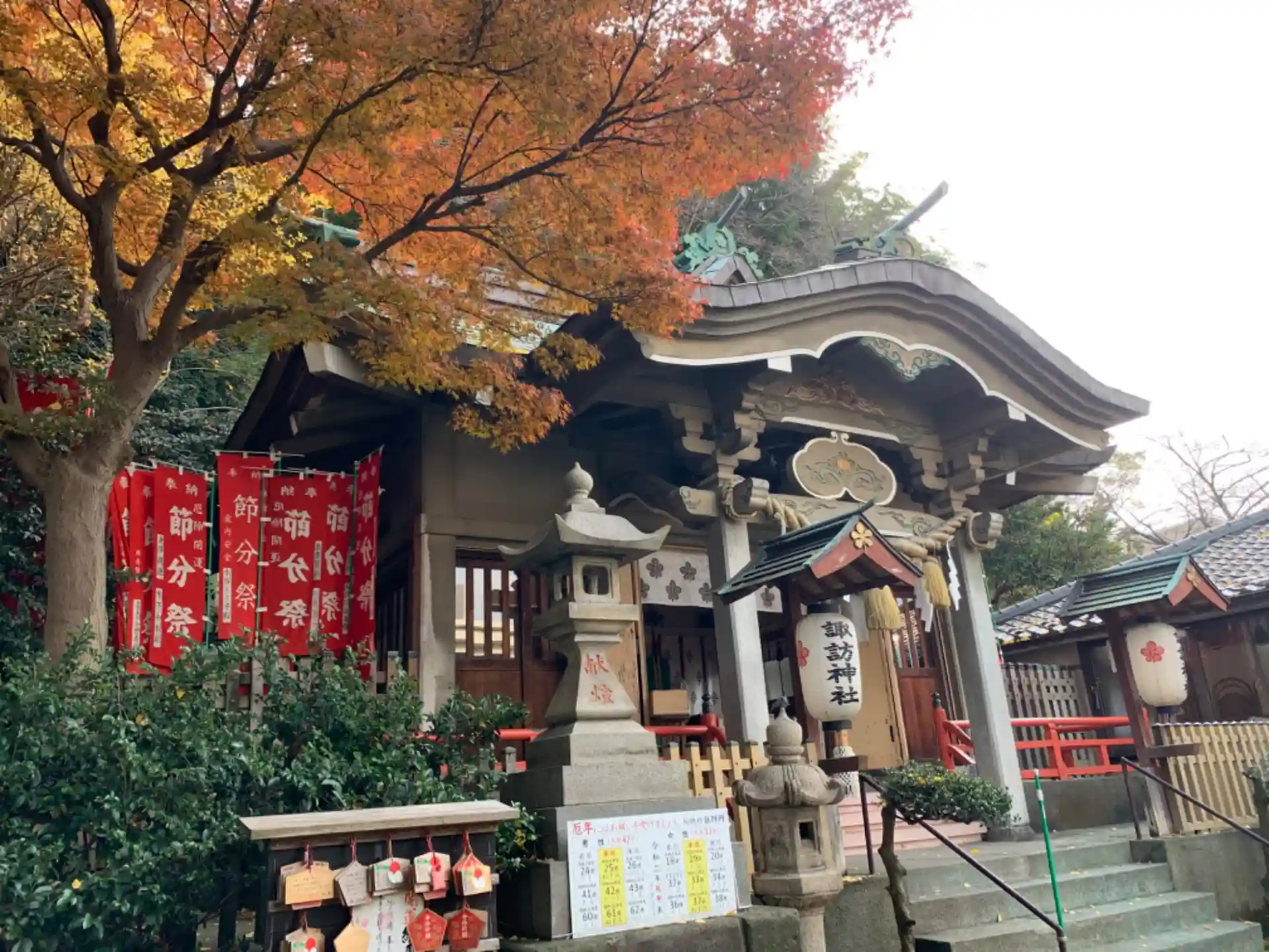 石川町諏訪神社の創建は、室町時代から戦国時代にかけての時代、文明13年です。具体的な創建の経緯は不明ですが、創建当時は現在よりも高所に祠があり、石川河岸を出入りする漁船の目印にもなっていたそうです。