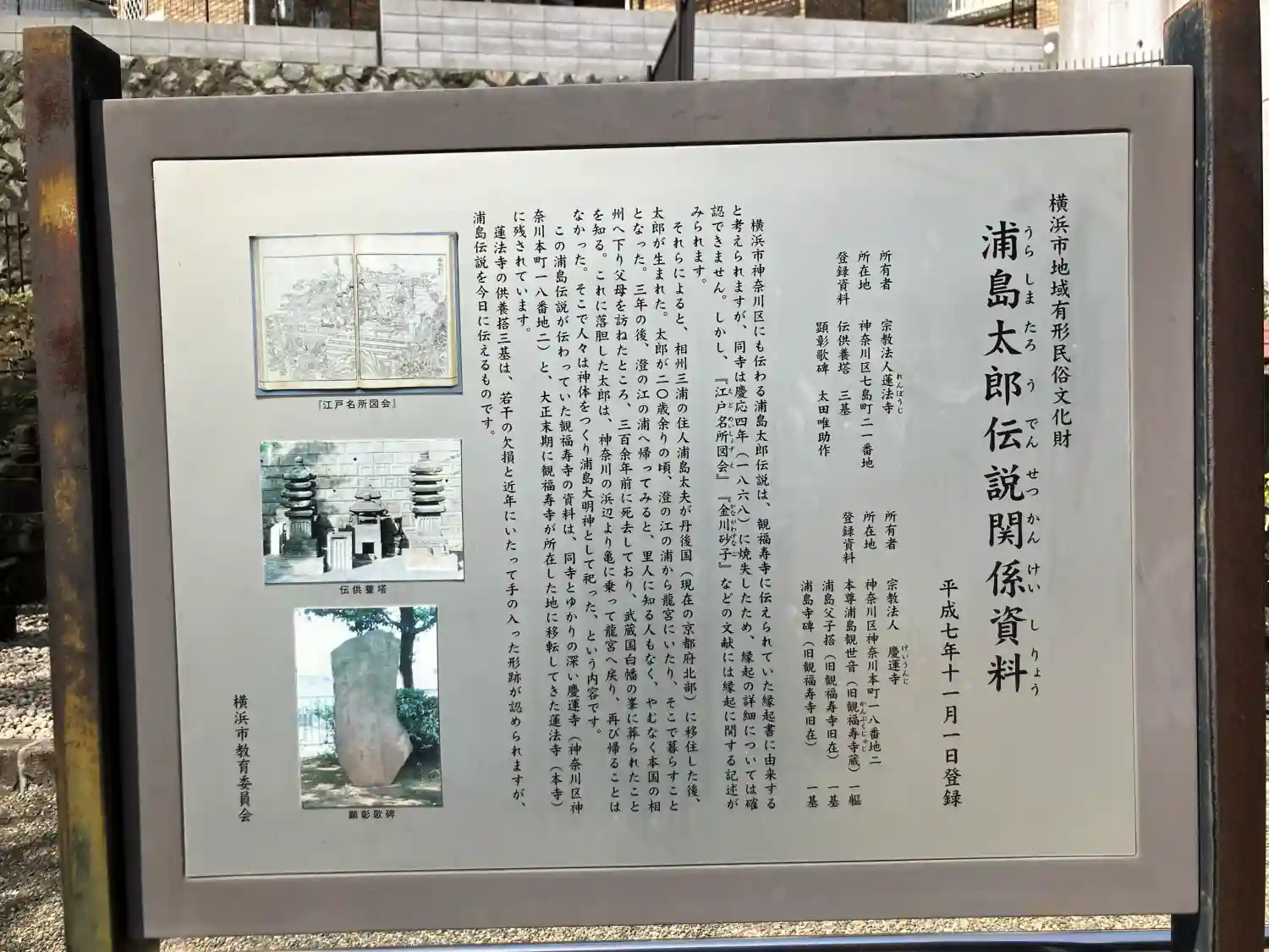 蓮法寺は、本照院日順が宝永7年(1710)、足柄下郡荻窪村(現•小田原市)に創建。明治44年(1911)に当地へ移転したと言います。当地にはかつて観福寺という真言宗寺院があり、観福寺には浦島太郎伝説が残されていたことから、当寺でも浦島太郎伝説の関係資料が残されています。