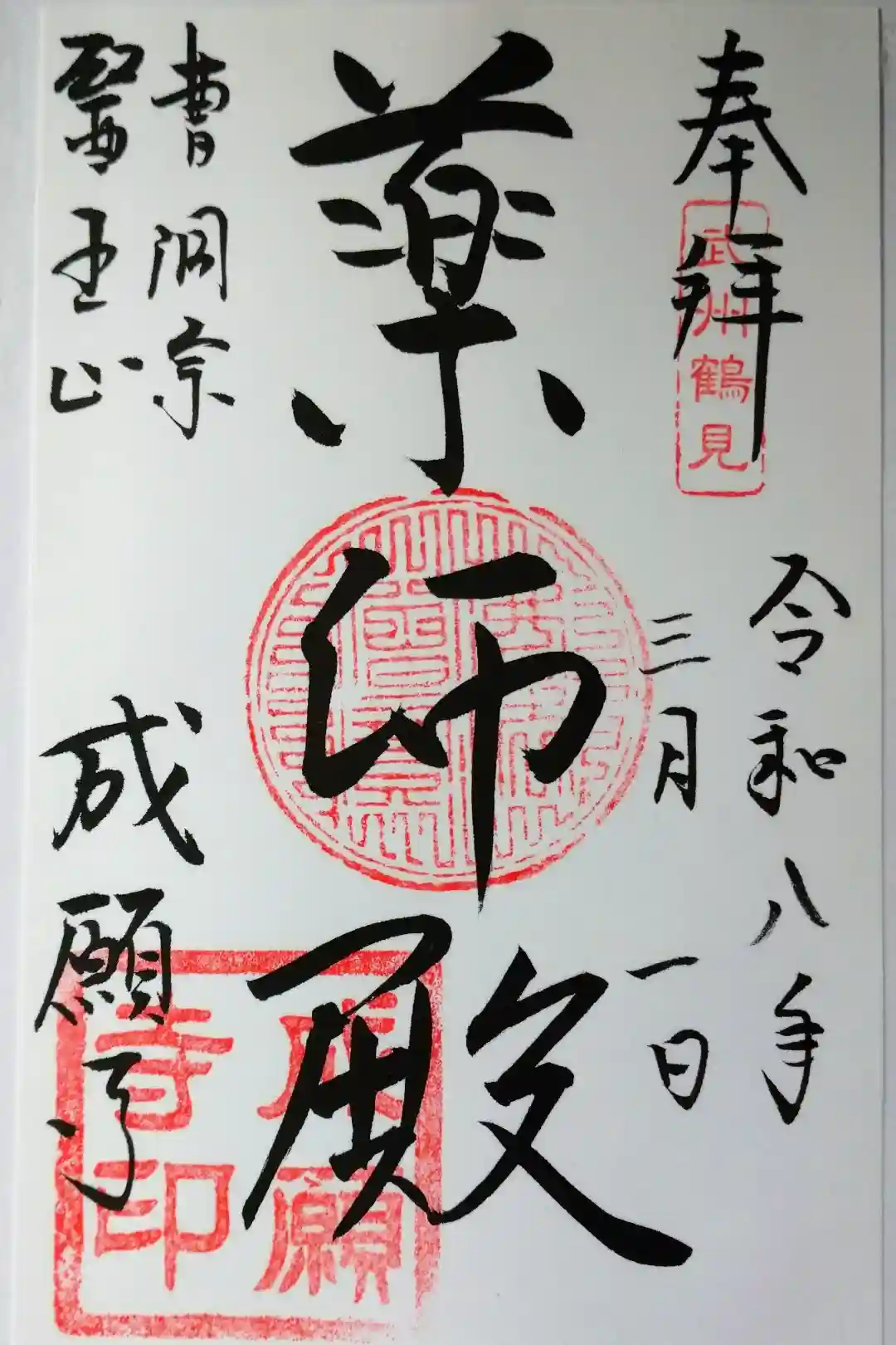 その後、天正3年(1575)馬場建功寺第二世聲庵守聞大和尚を御開山とする成願寺として建立された曹洞宗寺院が元和(1615-23)の頃、荒廃していた二見台貞観寺へ移転しました。江戸時代には薬師如来が篤く信仰され、寺領10石の朱印状を付与されており、『新編武蔵風土記』や『江戸時代図誌』にも記述が見られます。