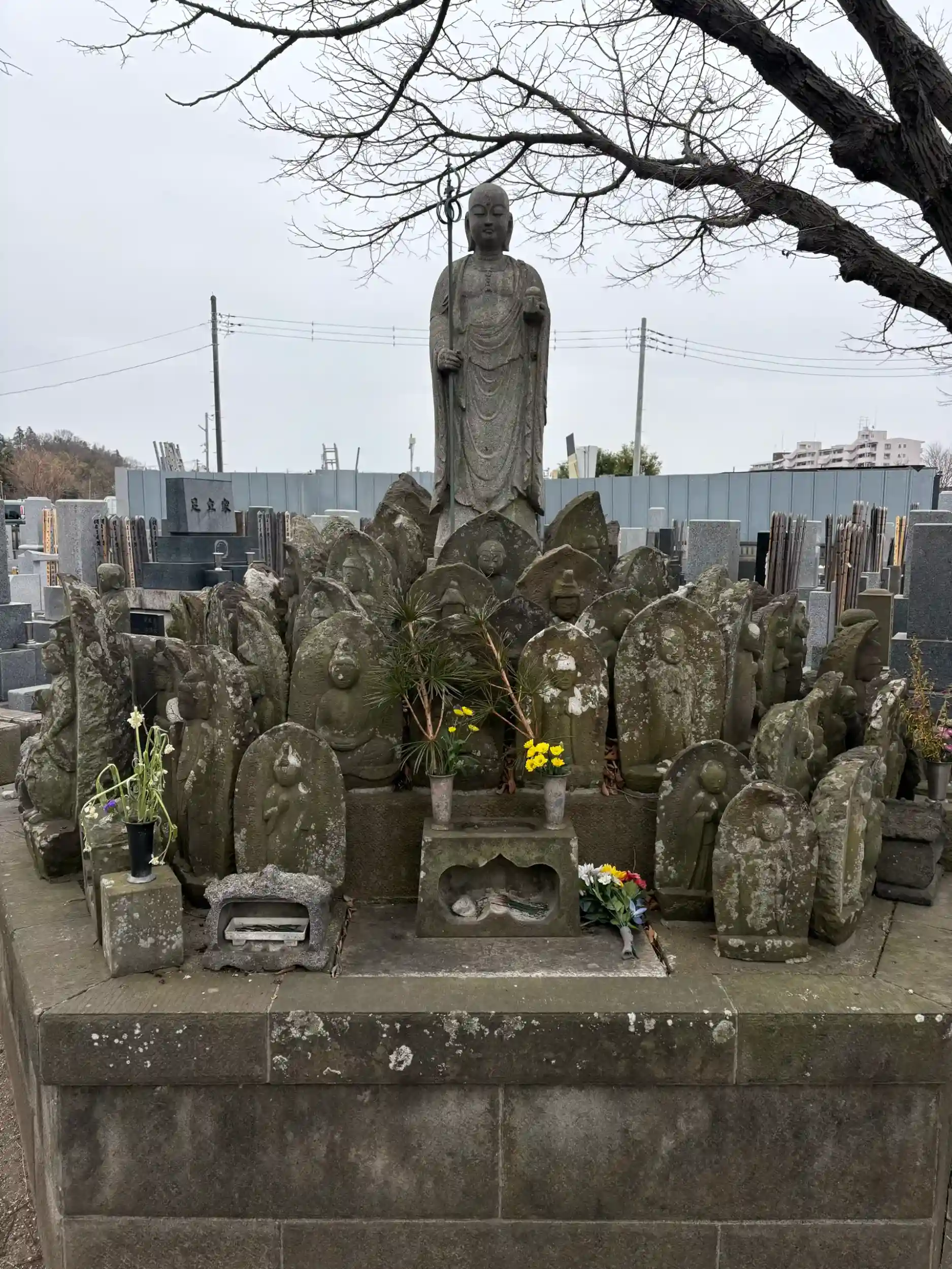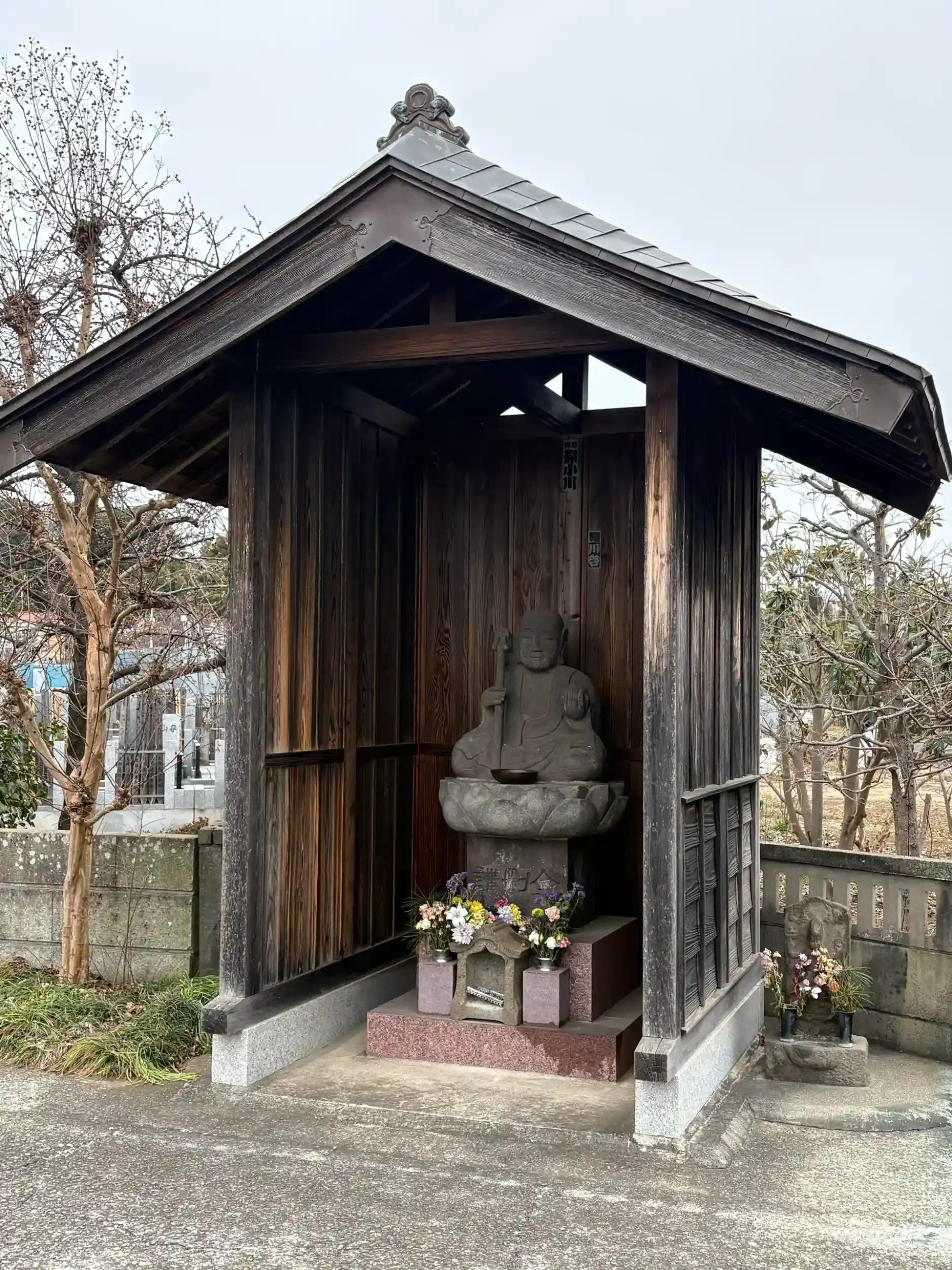 入り口手前のお堂に大型の石仏地蔵菩薩。墓地には江戸時代と思われる石仏がたくさんあります。