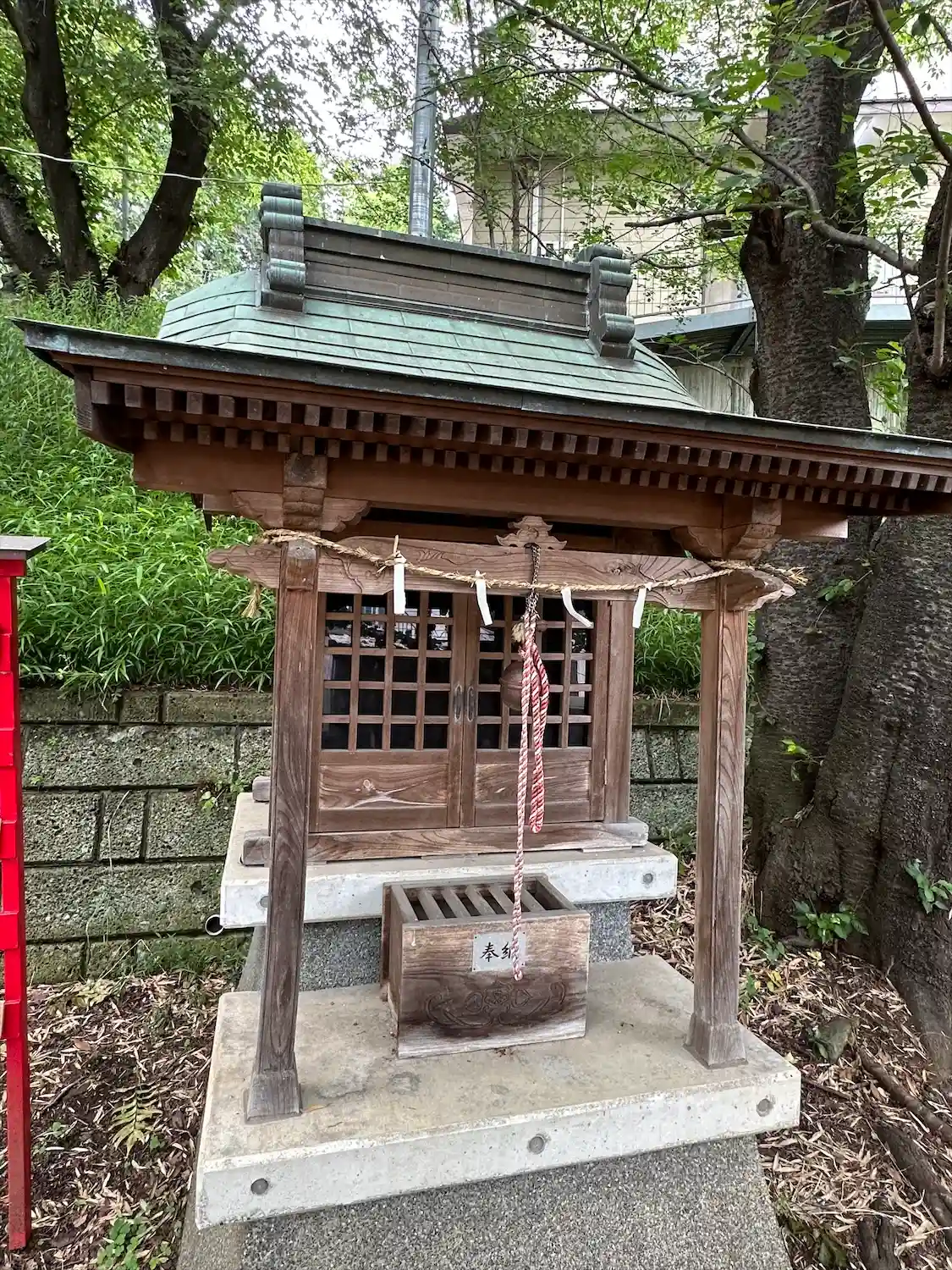 お賽銭箱は本殿の中のようですが、閉まってました。