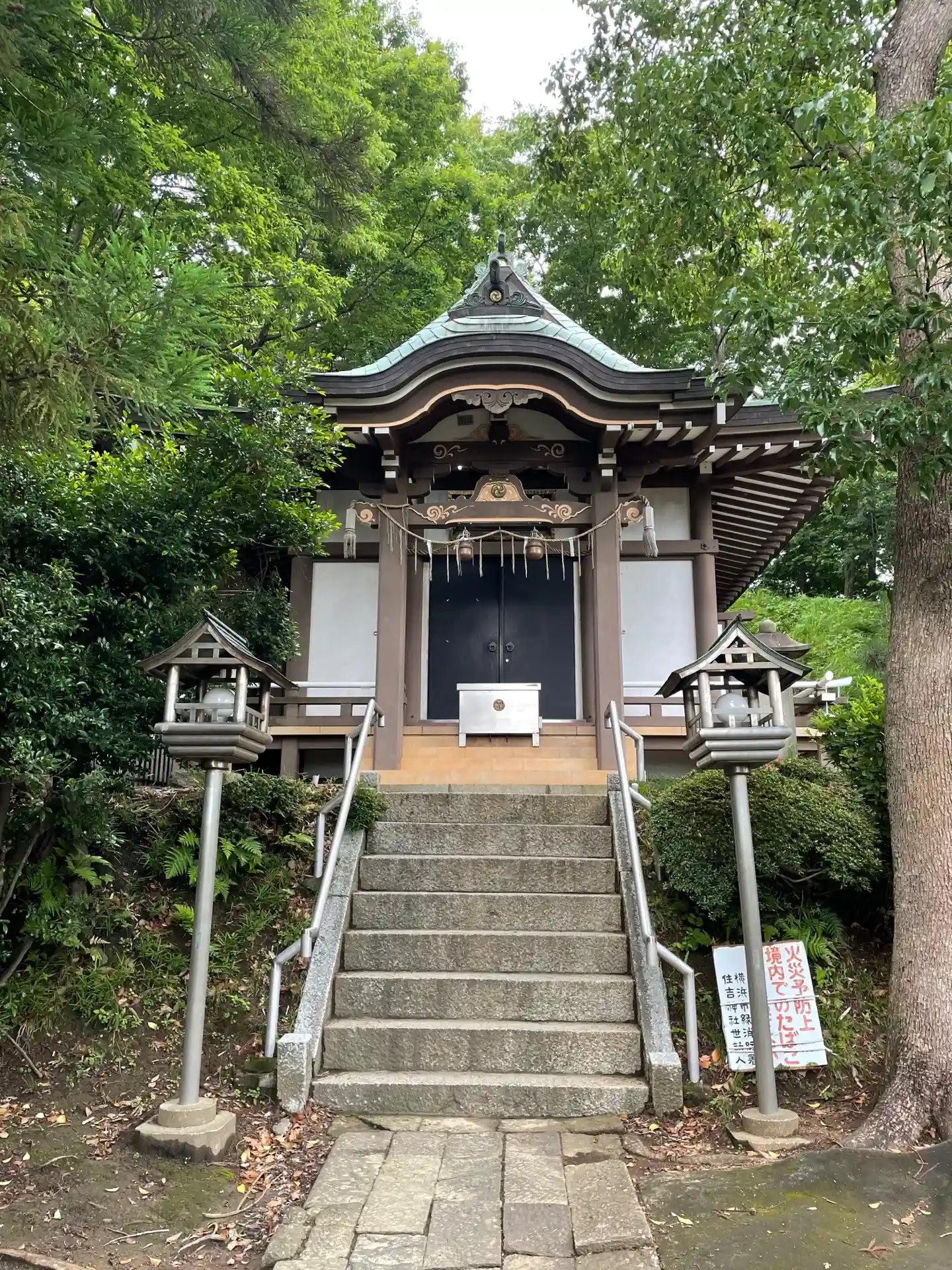 住吉神社@こどもの国。多摩丘陵の南端に突き出た台地の端に鎮座する自然豊かな森にあります。住吉神社の社叢林は横浜市指定天然記念物に指定されています。主にモミ、シラカシ、アラカシ等、常緑樹が生育しているとのこと。