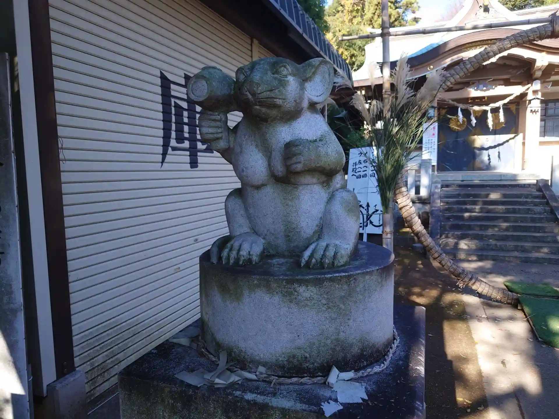 新羽神社に行くつもりで間違えて来てしまいました。社号標を見て間違いに気づきましたが折角なので参拝させていただきました。駐車場は無く、社号標の地点から少し道なりの上がると神社の裏手に出て、裏参道の入り口辺りにスペースがあったので、そちらに停めて裏参道から入りました。戸部杉山神社にもあったような狛ネズミ様、願いことを念じながら回そうとしても硬くて回らない!参拝者が少ないのだろう。時季外れの沈羽も設置されていましたが、コロナ禍の状況でいい意味と解釈いたしました。鳥居は石段途中にあったのでうまく撮れませんでしたが、石段上には干支のレリーフや大黒様などがあり、廃れた神社ではないことを感じさせてくれました。こちらの神社は無人で新羽杉山神社の兼務社ですが、御朱印の有無は不明です。
