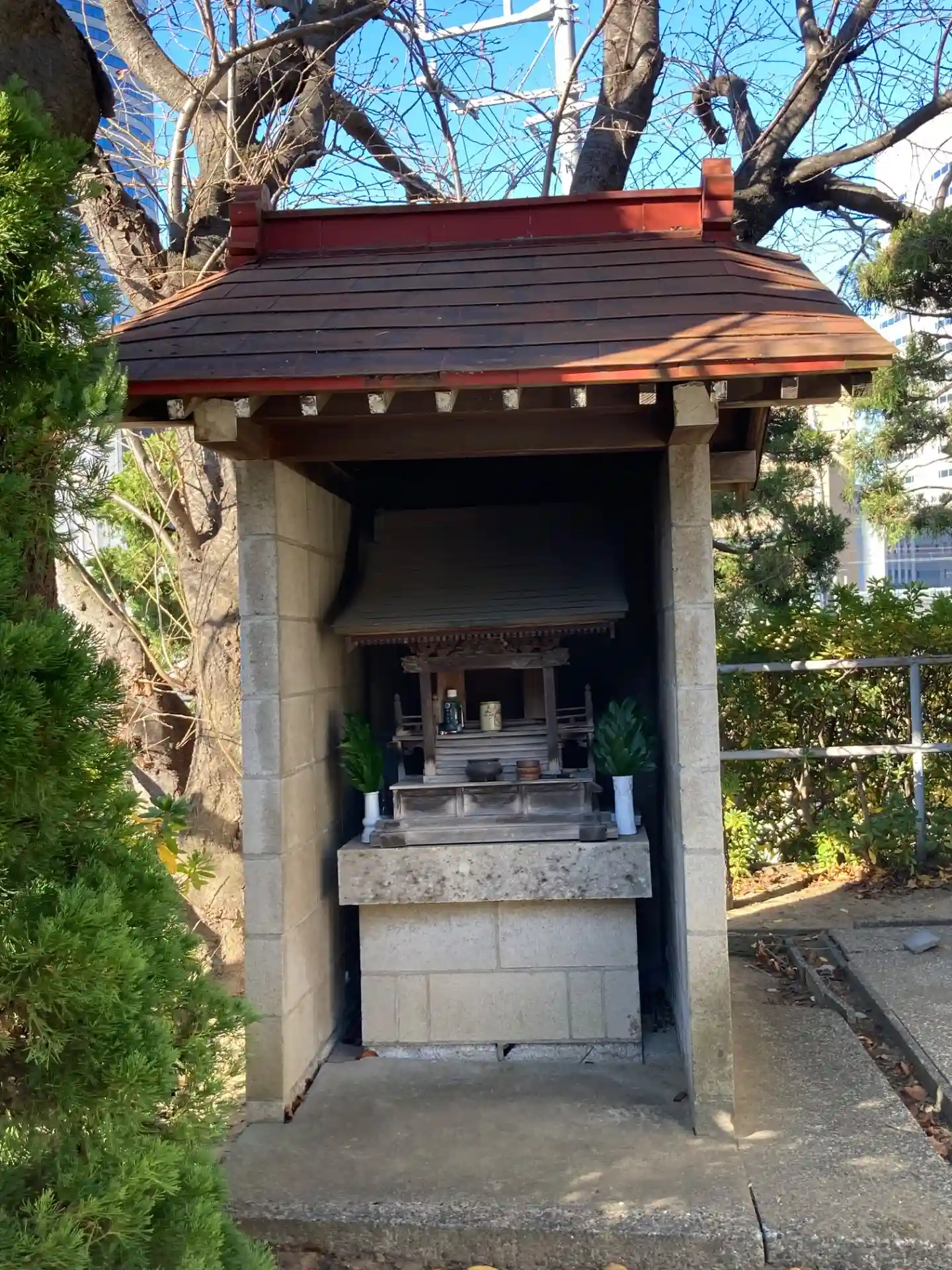 お寺高台から境内と、新横浜の街並みです。