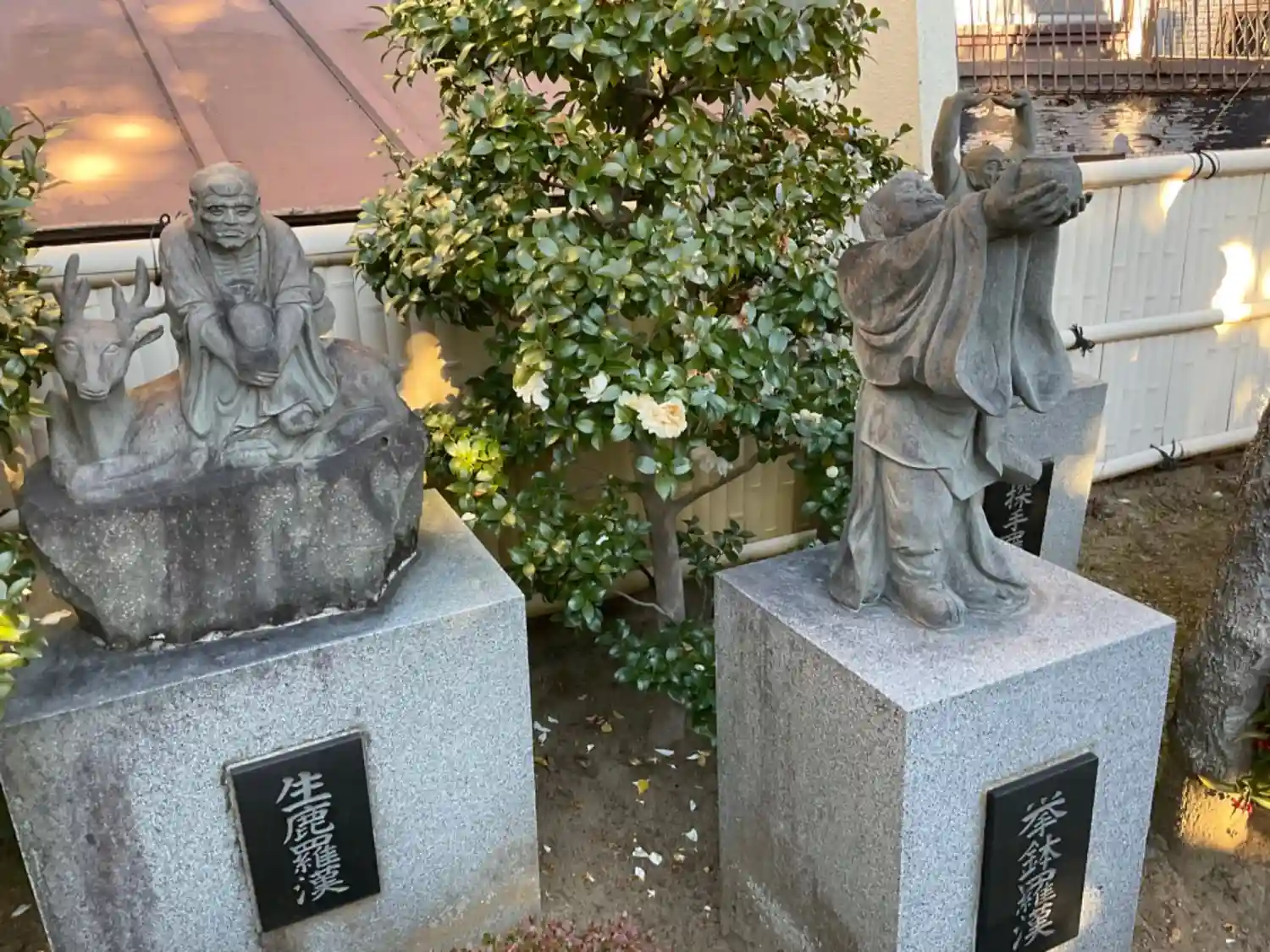 駐車中の車の裏手に羅漢像が並んでいます。