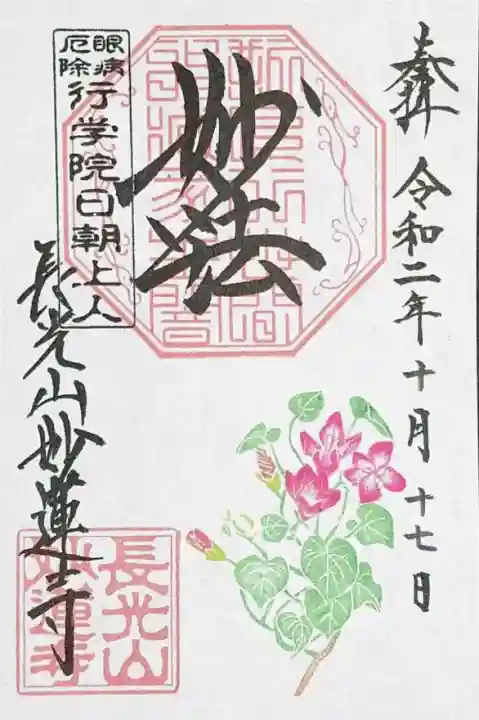 上部中央に妙法と書かれ、その下に印、左上に眼病厄除 行学院日朝上人の印、左下に長光山妙蓮寺の文字と長光山妙蓮寺の印、下部にアサガオが描かれています。