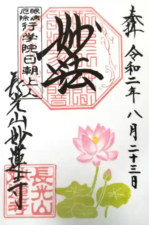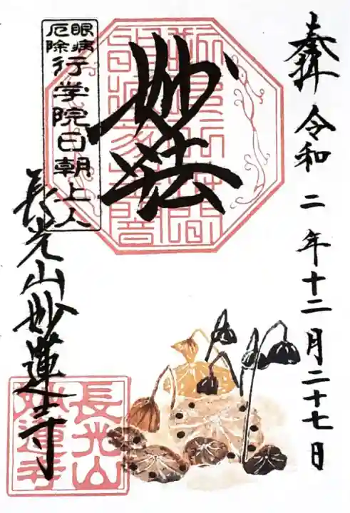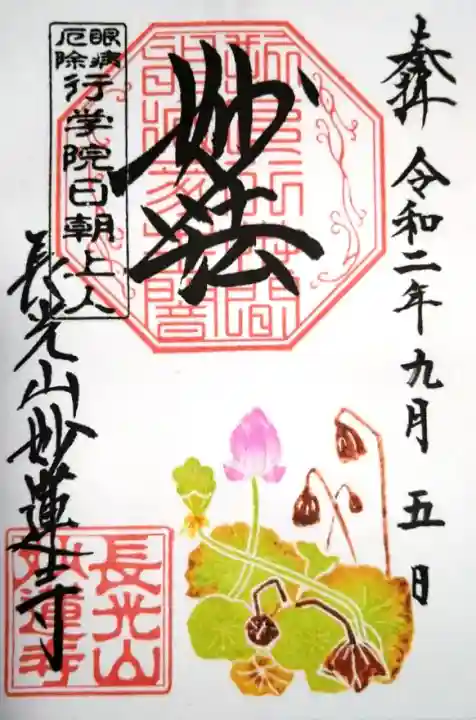上部中央に妙法と書かれ、その下に印、左上に眼病厄除 行学院日朝上人の印、左下に長光山妙蓮寺の文字と長光山妙蓮寺の印、下部にハスが描かれています。