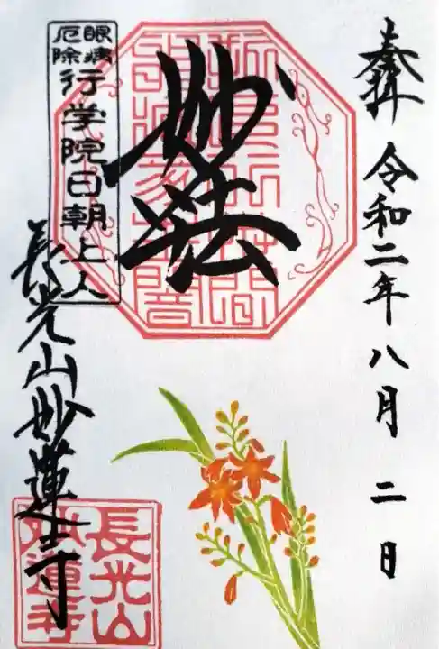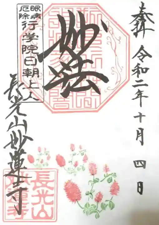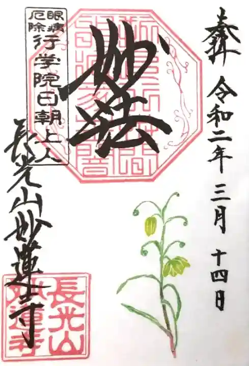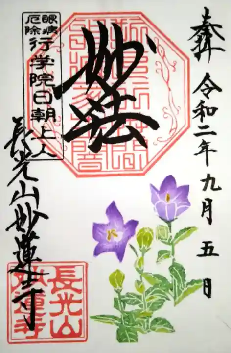 上部中央に妙法と書かれ、その下に印、左上に眼病厄除 行学院日朝上人の印、左下に長光山妙蓮寺の文字と長光山妙蓮寺の印、下部にキキョウが描かれています。