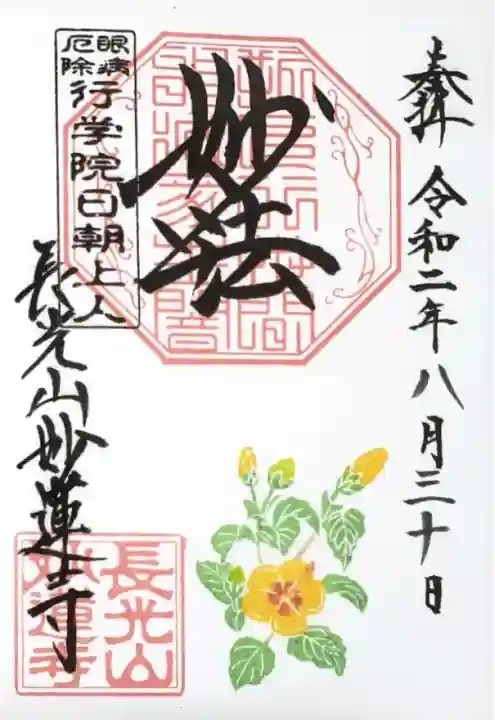 上部中央に妙法と書かれ、その下に印、左上に眼病厄除 行学院日朝上人の印、左下に長光山妙蓮寺の文字と長光山妙蓮寺の印、下部にハイビスカスが描かれています。
