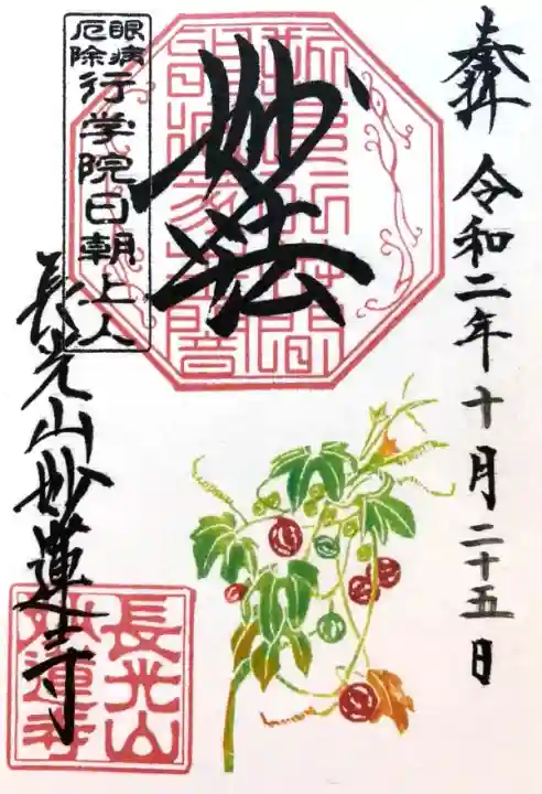 上部中央に妙法と書かれ、その下に印、左上に眼病厄除 行学院日朝上人の印、左下に長光山妙蓮寺の文字と長光山妙蓮寺の印、下部に変わり咲きアサガオが描かれています。