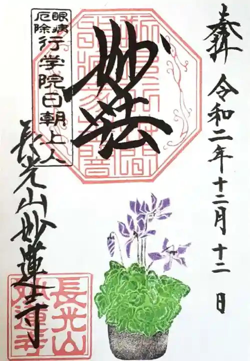 上部中央に妙法と書かれ、その下に印、左上に眼病厄除 行学院日朝上人の印、左下に長光山妙蓮寺の文字と長光山妙蓮寺の印、下部にシクラメンが描かれています。