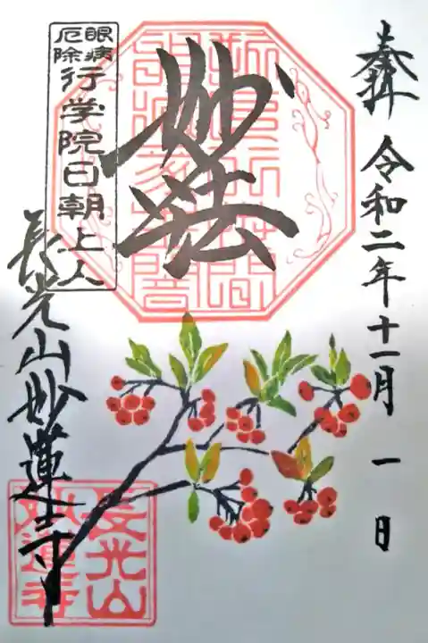 上部中央に妙法と書かれ、その下に印、左上に眼病厄除 行学院日朝上人の印、左下に長光山妙蓮寺の文字と長光山妙蓮寺の印、下部にアロニアが描かれています。